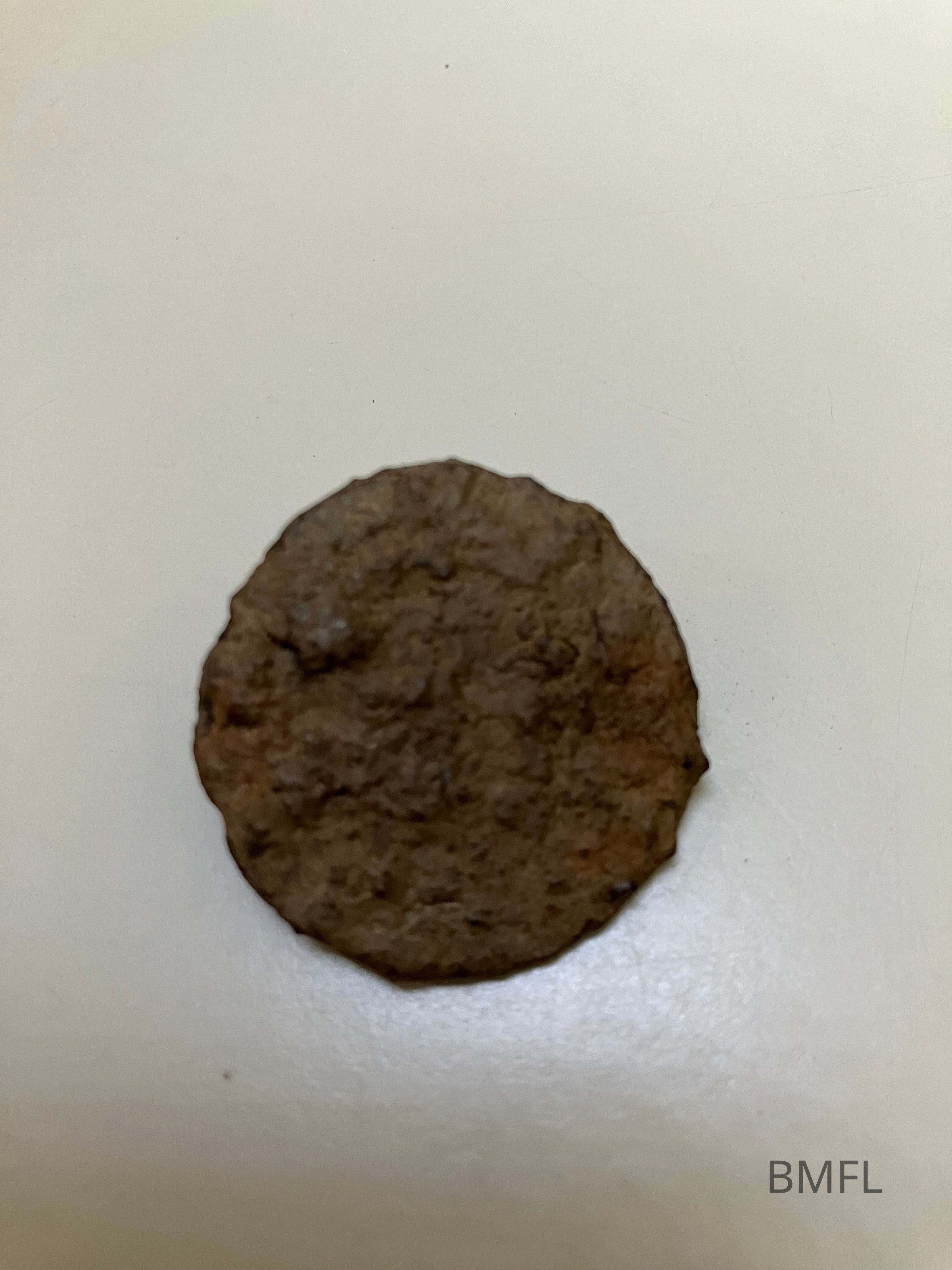 Much corroded, rough-topped button with stub in which the hole has filled in.Collection