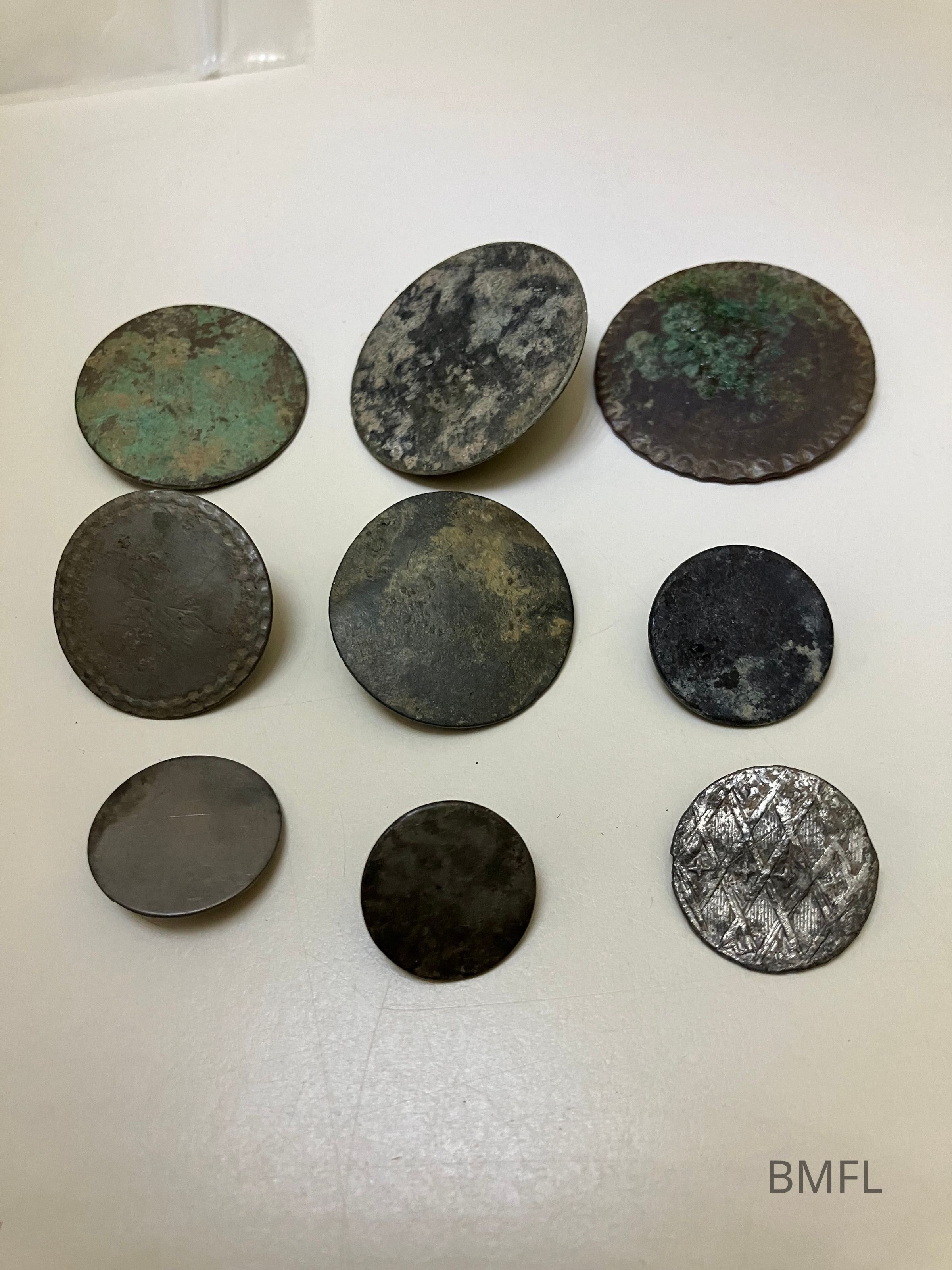 Nine metal buttons with loops or stubs where loops once existed for attaching to garments.
