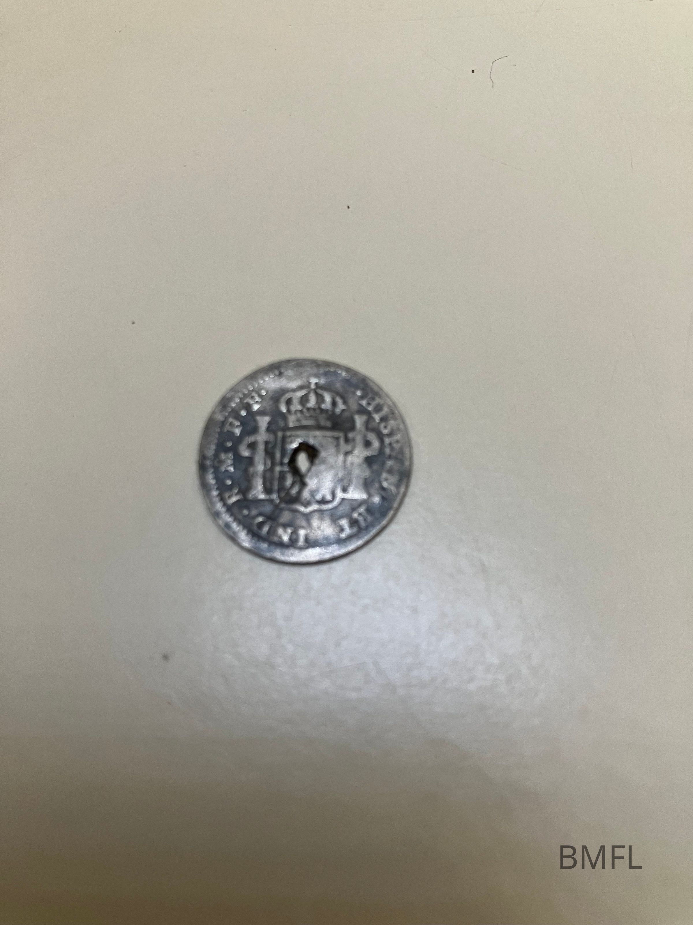 Silver coin with a crest and crown on one side. On the outside edge is the following: Hispan et Ind. R.M.F.M.Context