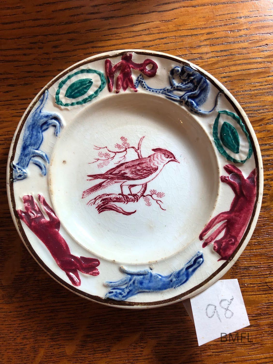 Pottery cup plate with colorful animals "running" around the rim and a bird on a branch in the center. In good condition, most likely made in EnglandUse