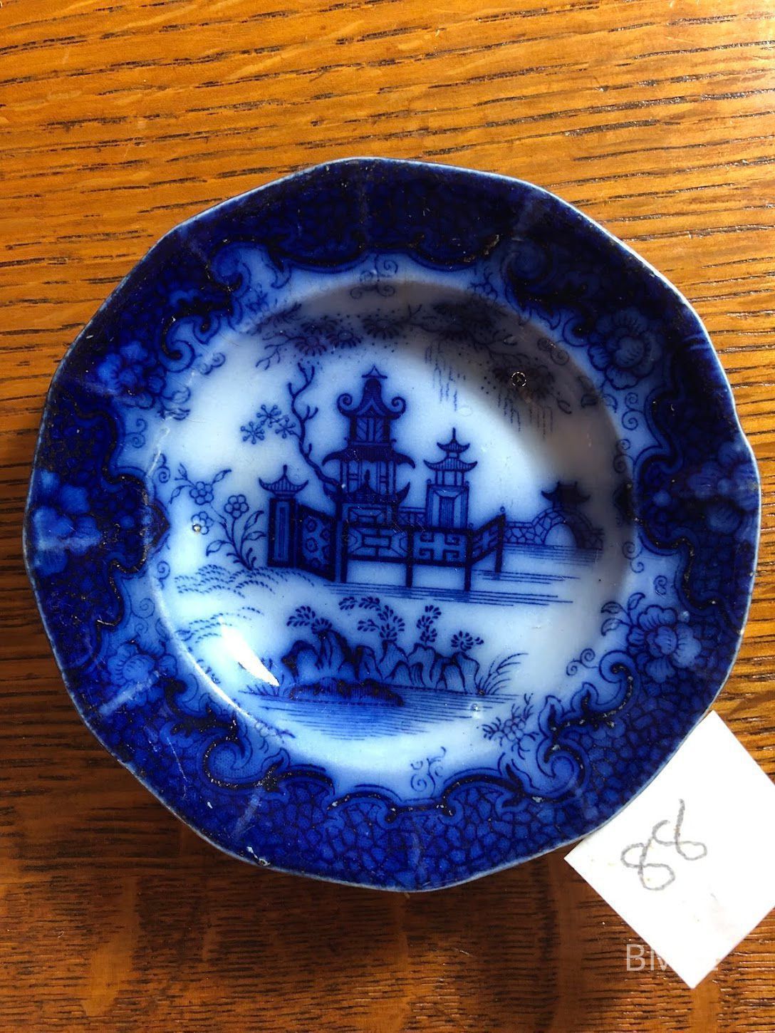 Deep blue and white pottery cup plate with Asian buildings. In good condition. Most likely made in EnglandUse