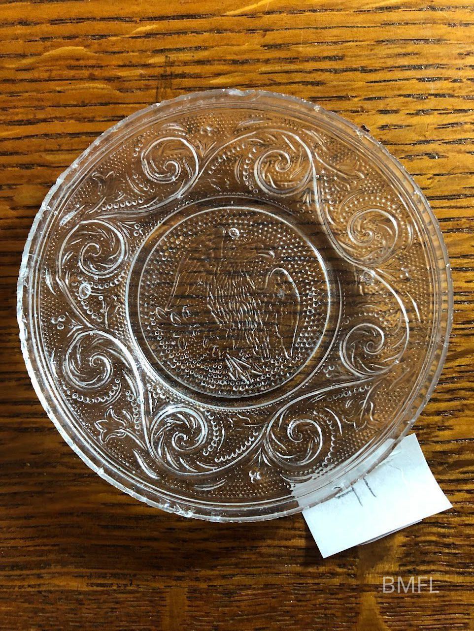 Clear glass cup plate with pressed design of eagle. PlentifulUse