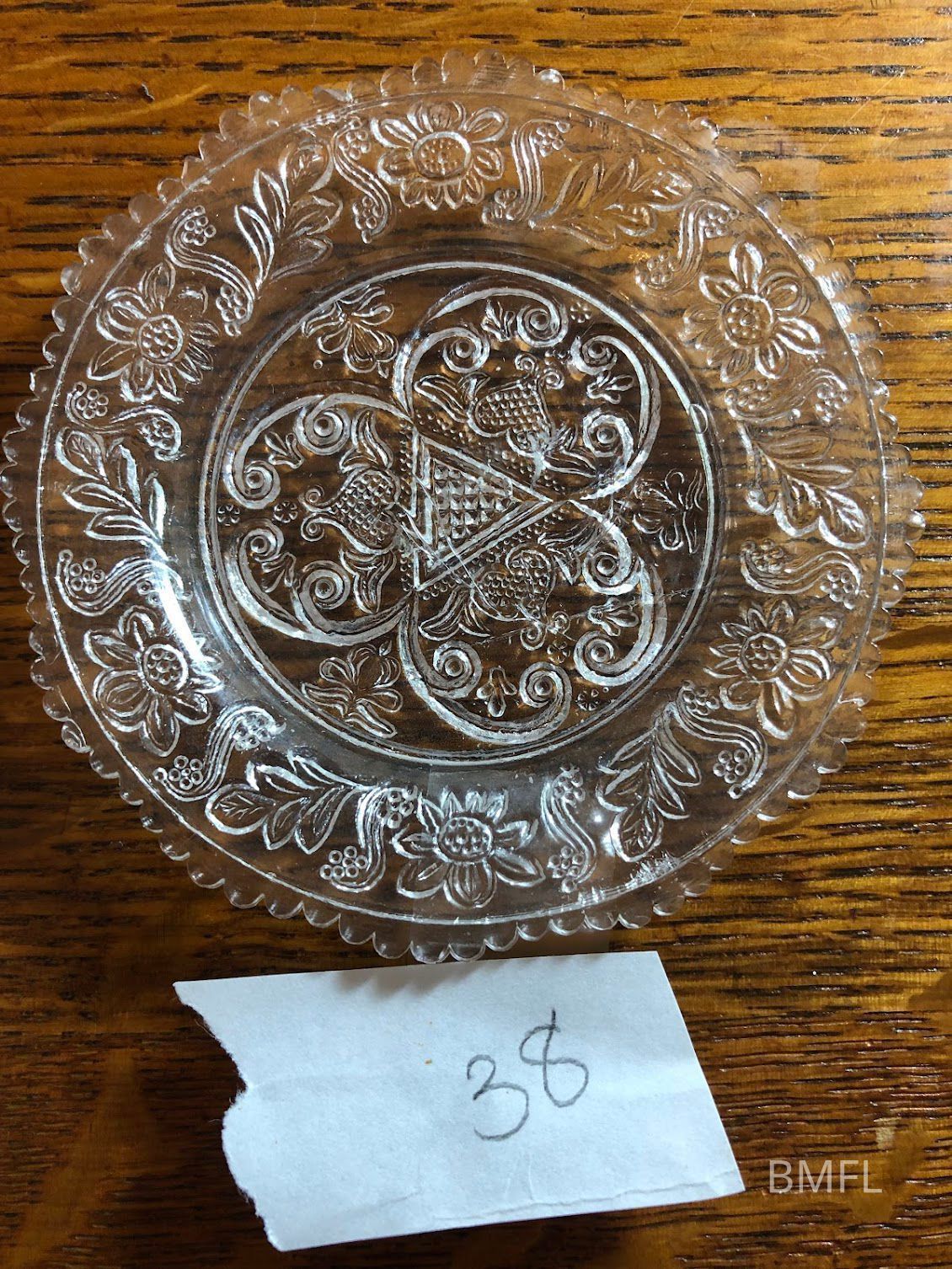 Clear glass cup plate with several small chips and a pressed design. PlentifulUse