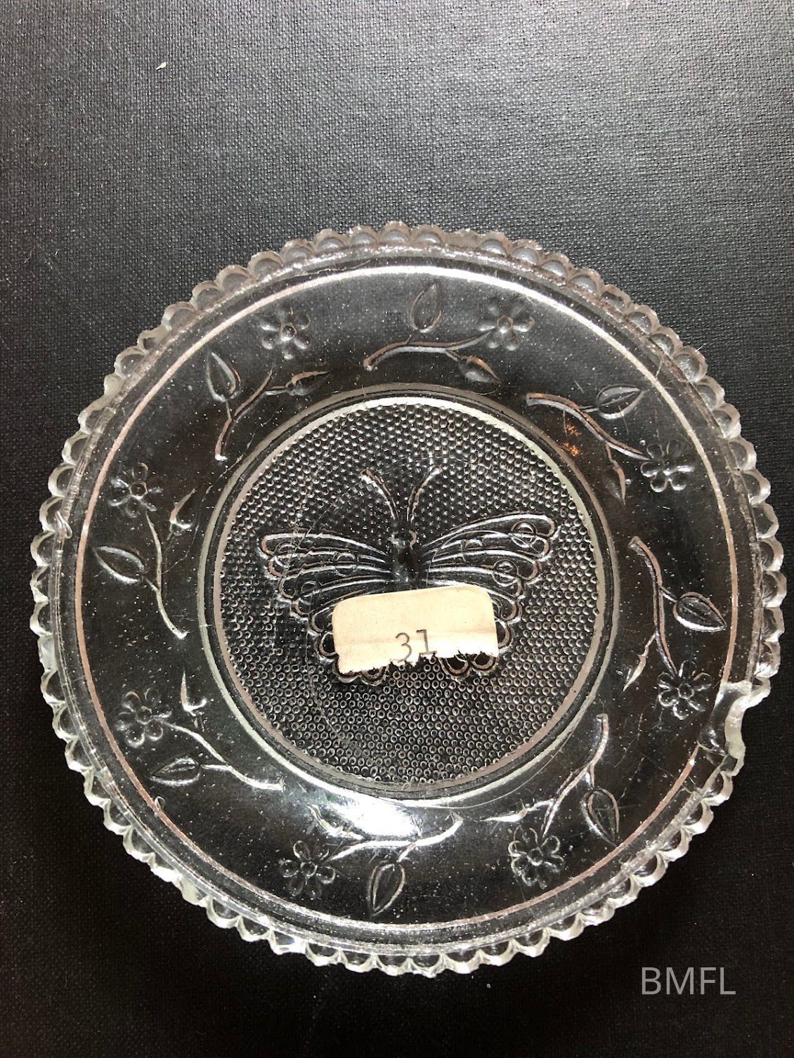 Clear glass cup plate with 6 chips and a pressed design. CommonUse