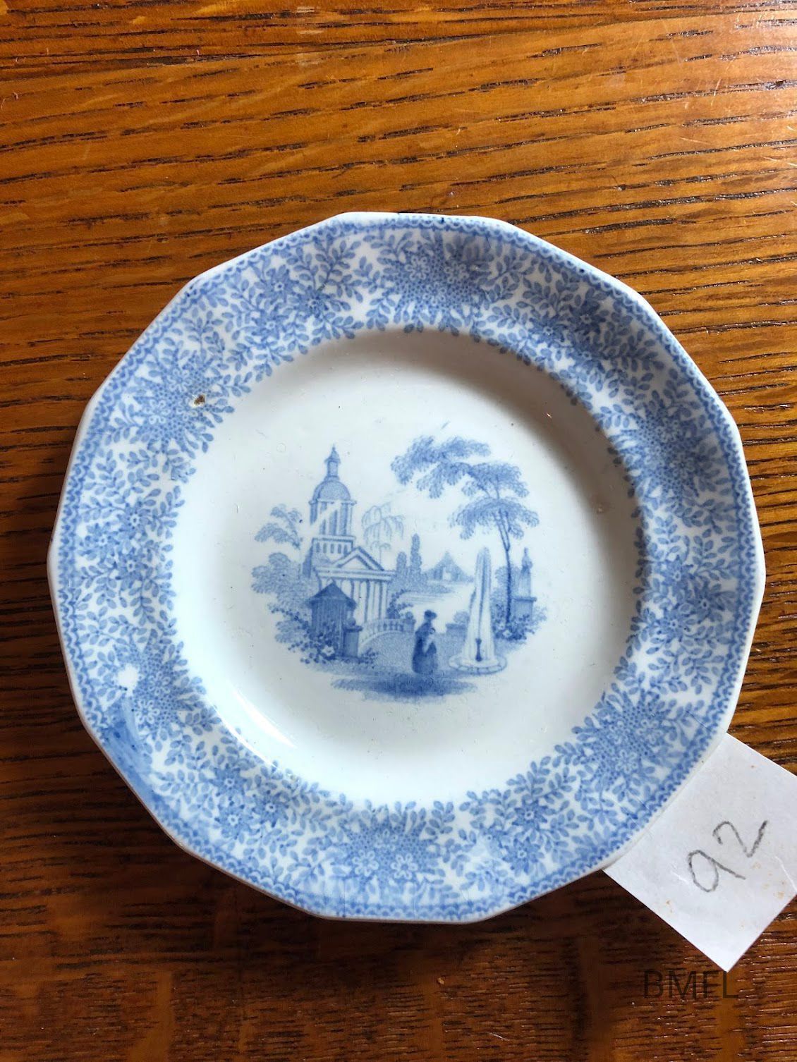 Light blue patterned cup plate with bucolic scene. Most likely made in EnglandUse