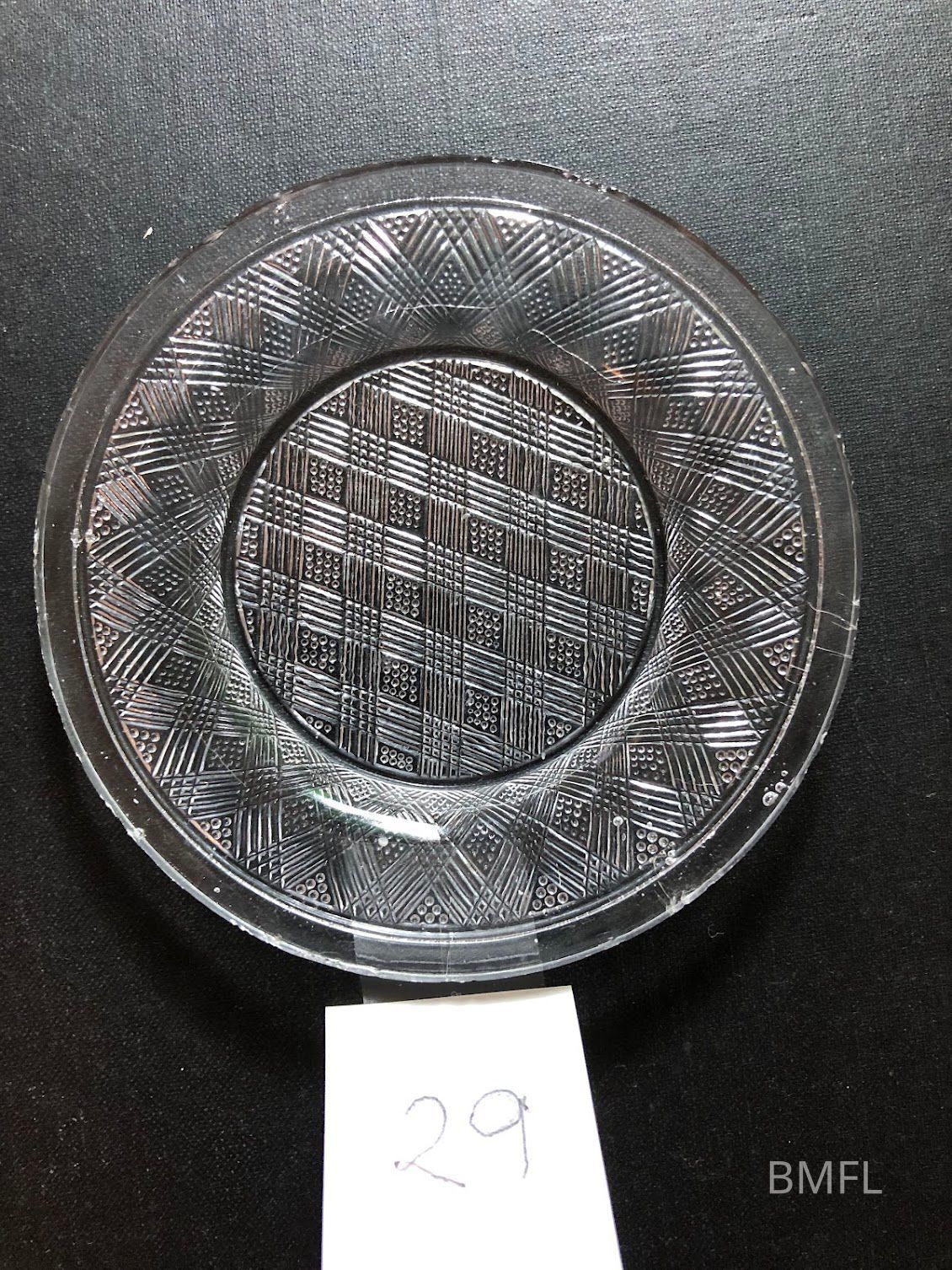 Clear glass cup plate with pressed design. CommonUse