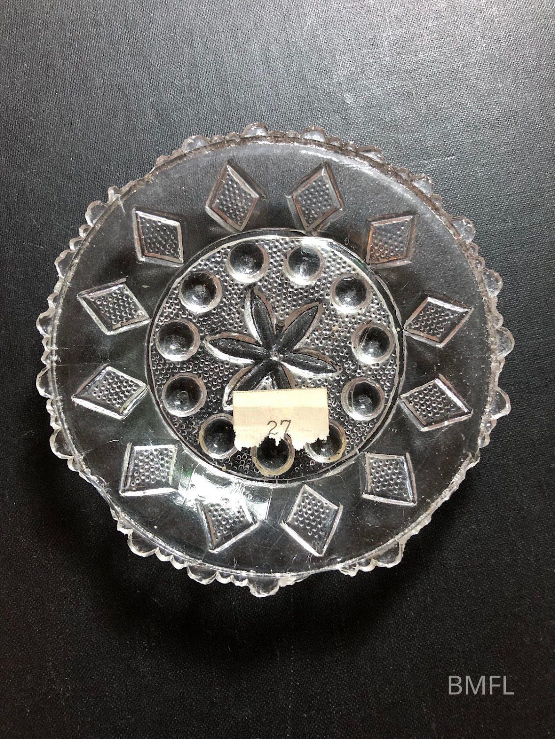 Clear glass cup plate with several chips and a pressed design. CommonUse