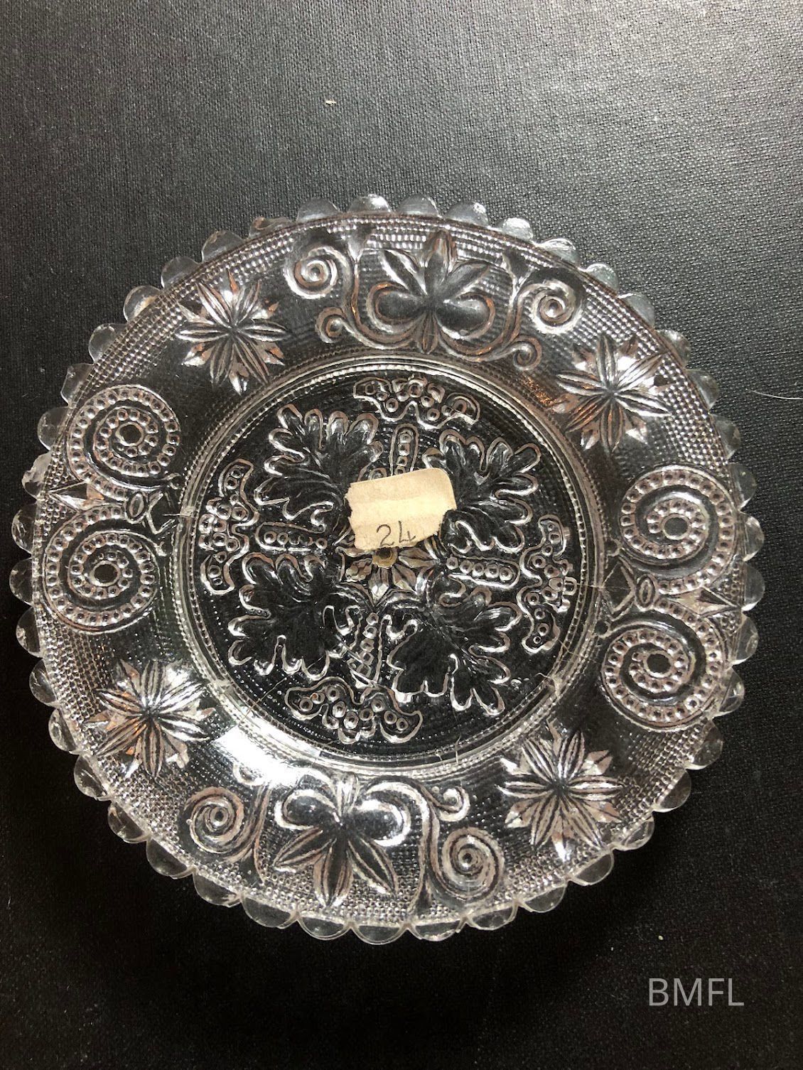 An article published in January of 1951 announced a donation to the Bixby Library from the late Josephine Meneely: her collection of glass cup plates, along with glass paperweights. The article explained cup plates as follows: "Cup plates were not coasters as those unfamiliar with antiques sometimes believe. Inn the 1820s and 1830s it was considered the proper thing to drink tea from the saucer instead of the handleless cup. When the tea was poured into the saucer, the cup was placed on a small cup plate of glass, sometimes of china, to avoid soiling the tablecloth. the fashion changed when cups again were made with handles. Cup plates were smaller than honey plates or preserve dishes, about three inches in diameter."Collection