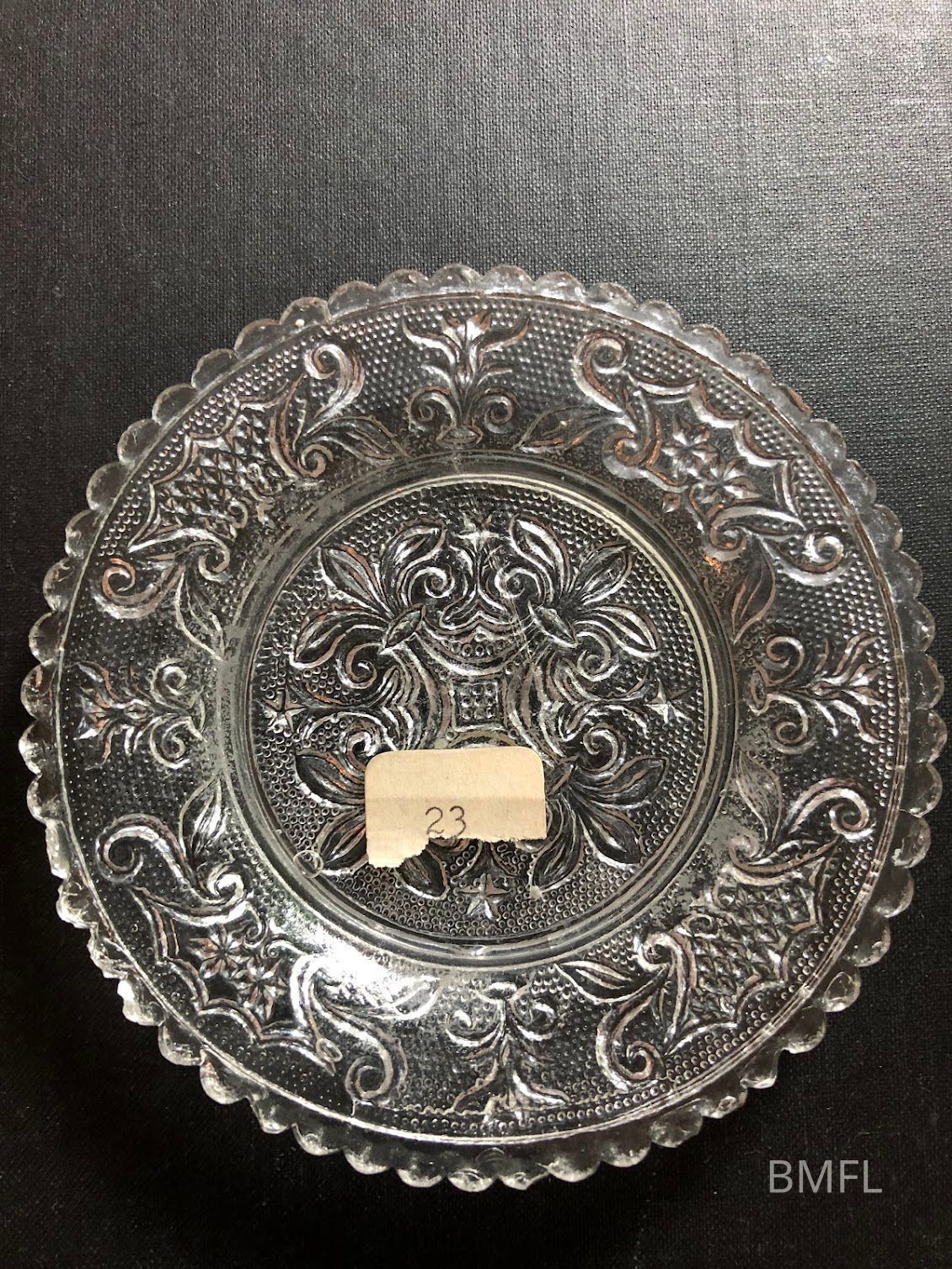 An article published in January of 1951 announced a donation to the Bixby Library from the late Josephine Meneely: her collection of glass cup plates, along with glass paperweights. The article explained cup plates as follows: "Cup plates were not coasters as those unfamiliar with antiques sometimes believe. Inn the 1820s and 1830s it was considered the proper thing to drink tea from the saucer instead of the handleless cup. When the tea was poured into the saucer, the cup was placed on a small cup plate of glass, sometimes of china, to avoid soiling the tablecloth. the fashion changed when cups again were made with handles. Cup plates were smaller than honey plates or preserve dishes, about three inches in diameter."Collection