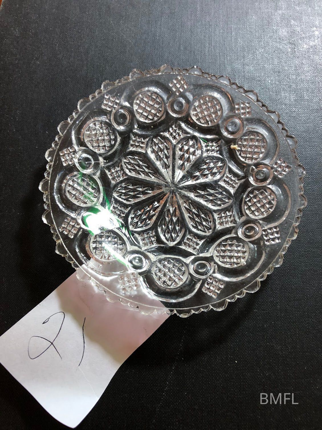 Clear glass cup plate with 1 chip and pressed design. CommonUse