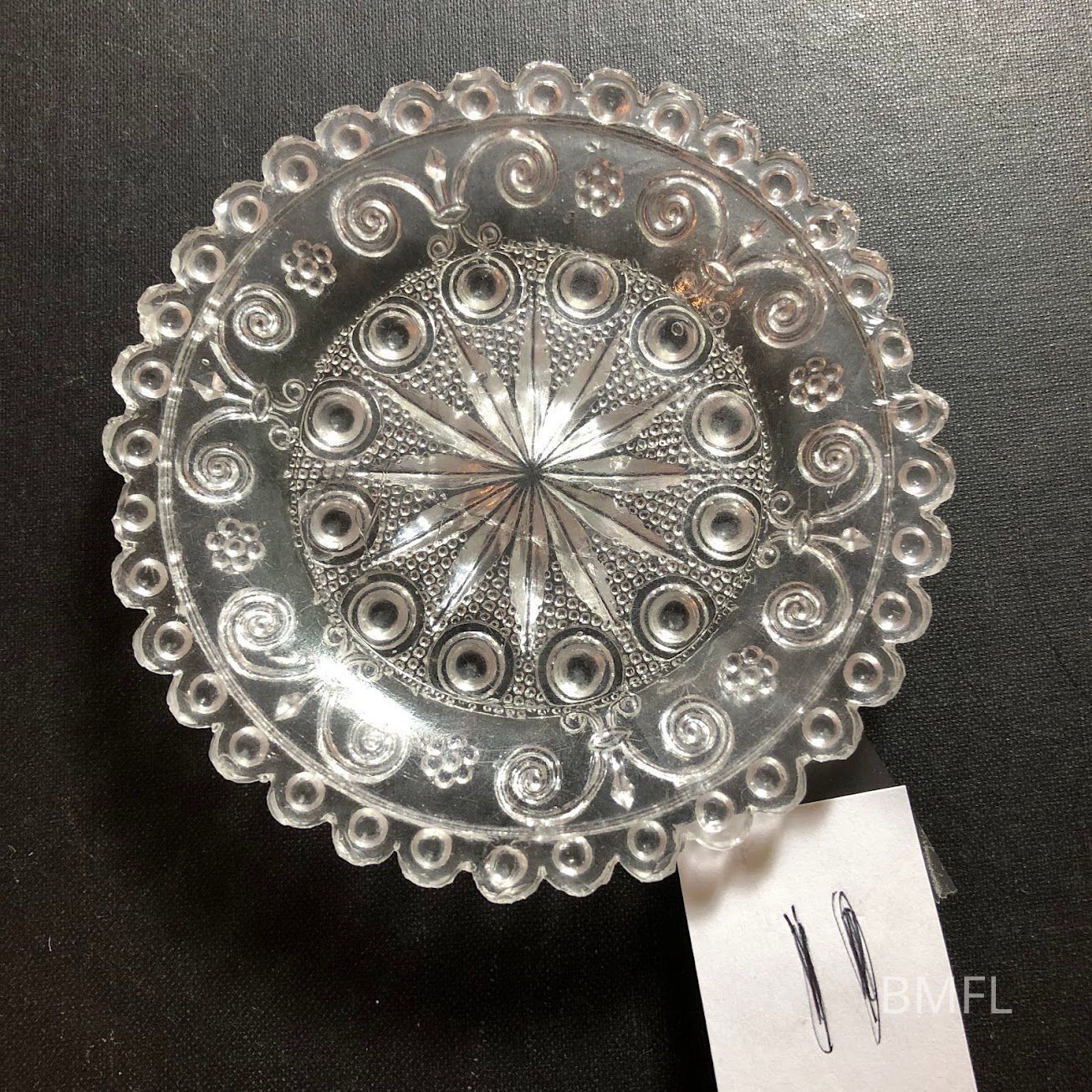 Clear glass cup plate with large chip and pressed design. ScarceUse