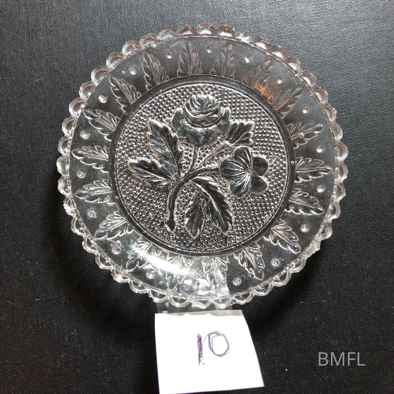 Clear glass cup plate with small chip and pressed design. PlentifulUse