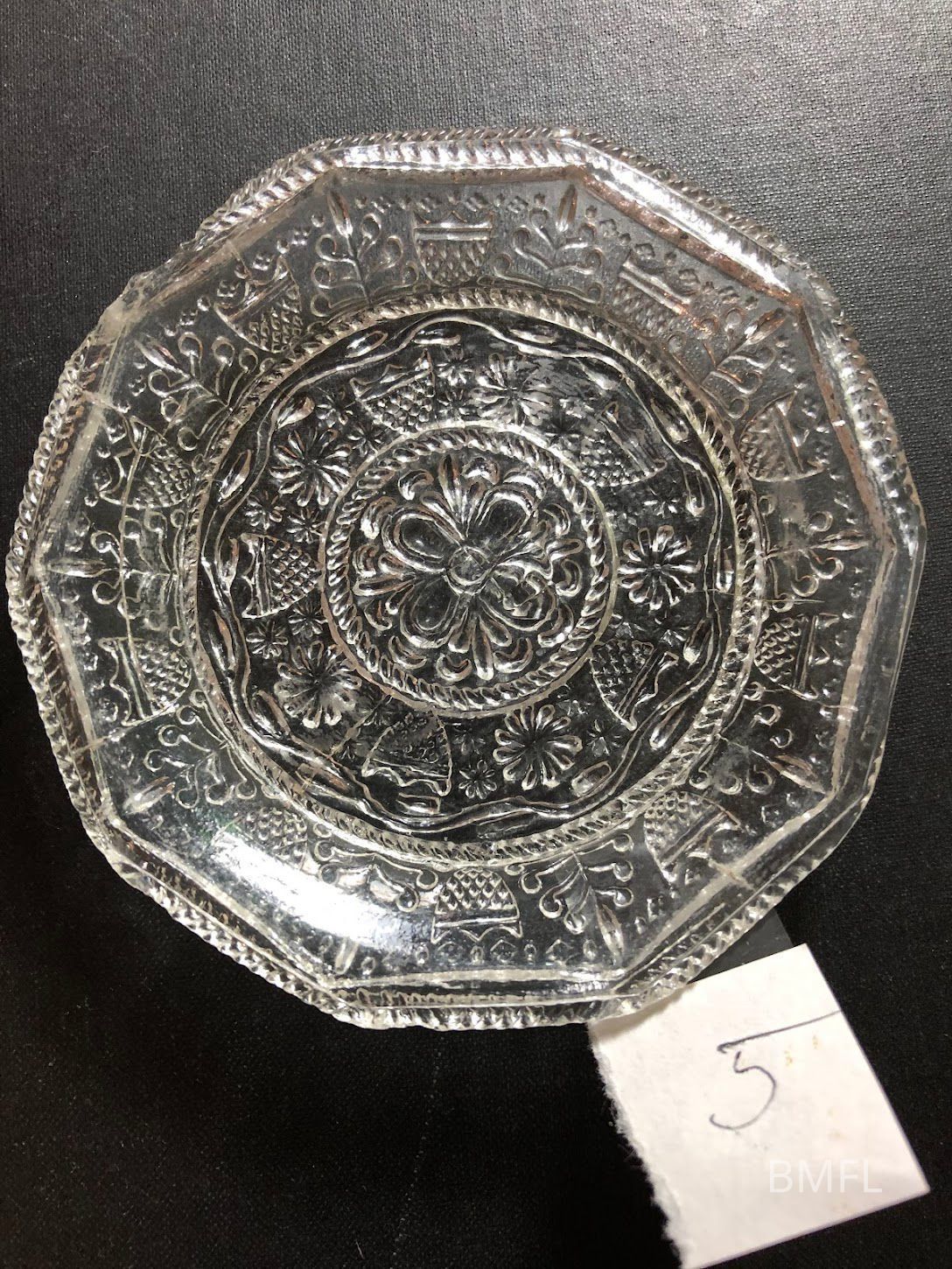 Clear glass cup plate with chip and pressed design. Made in plentiful numbers.Use