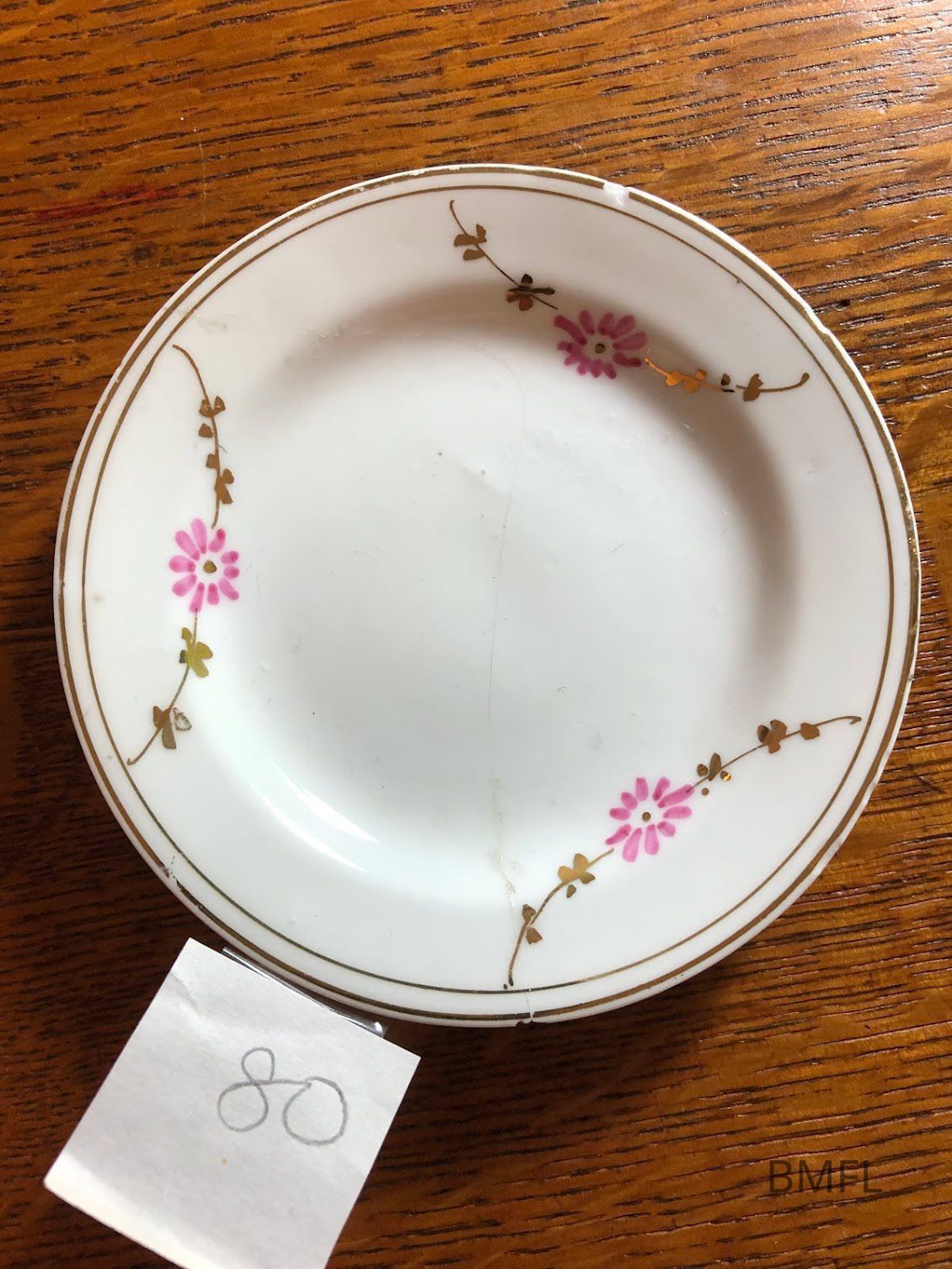 Pottery cup plate with simple design, a well-glued crack across the entire plate, and several small chips. Most likely made in EnglandUse
