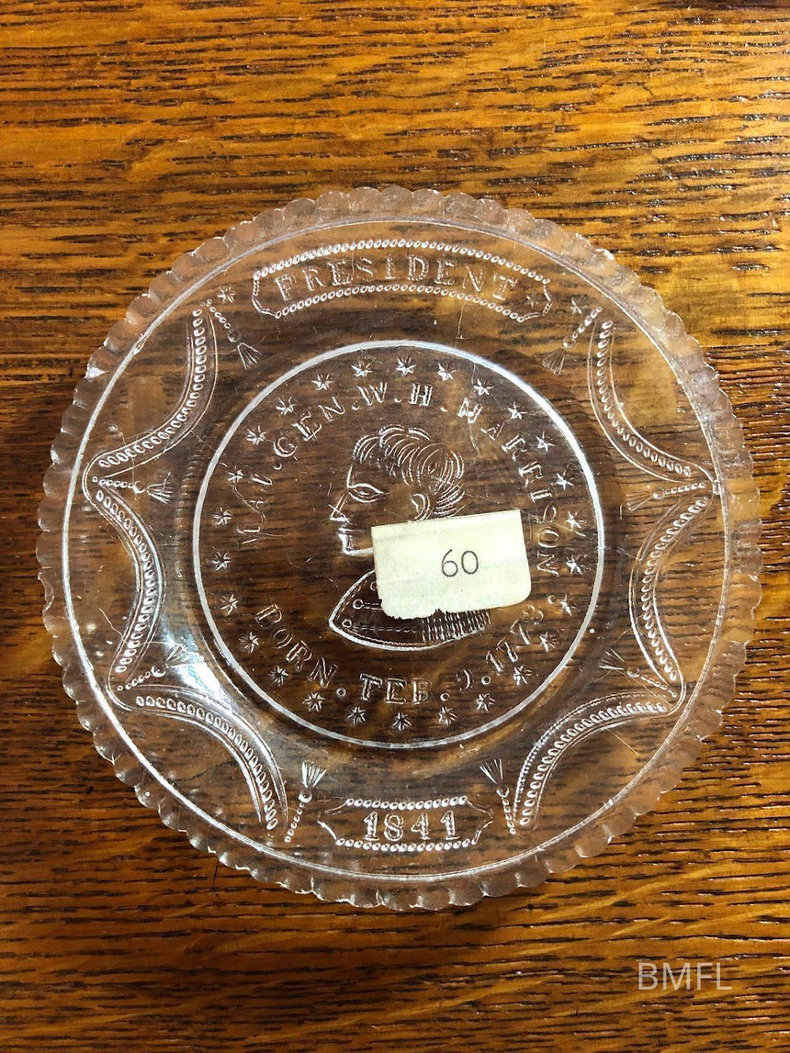 Clear glass cup plate commemorating President (and Major General) W. H. Harrison, who was U.S. President for one month in 1841, before his death in office. Pressed design. PlentifulUse