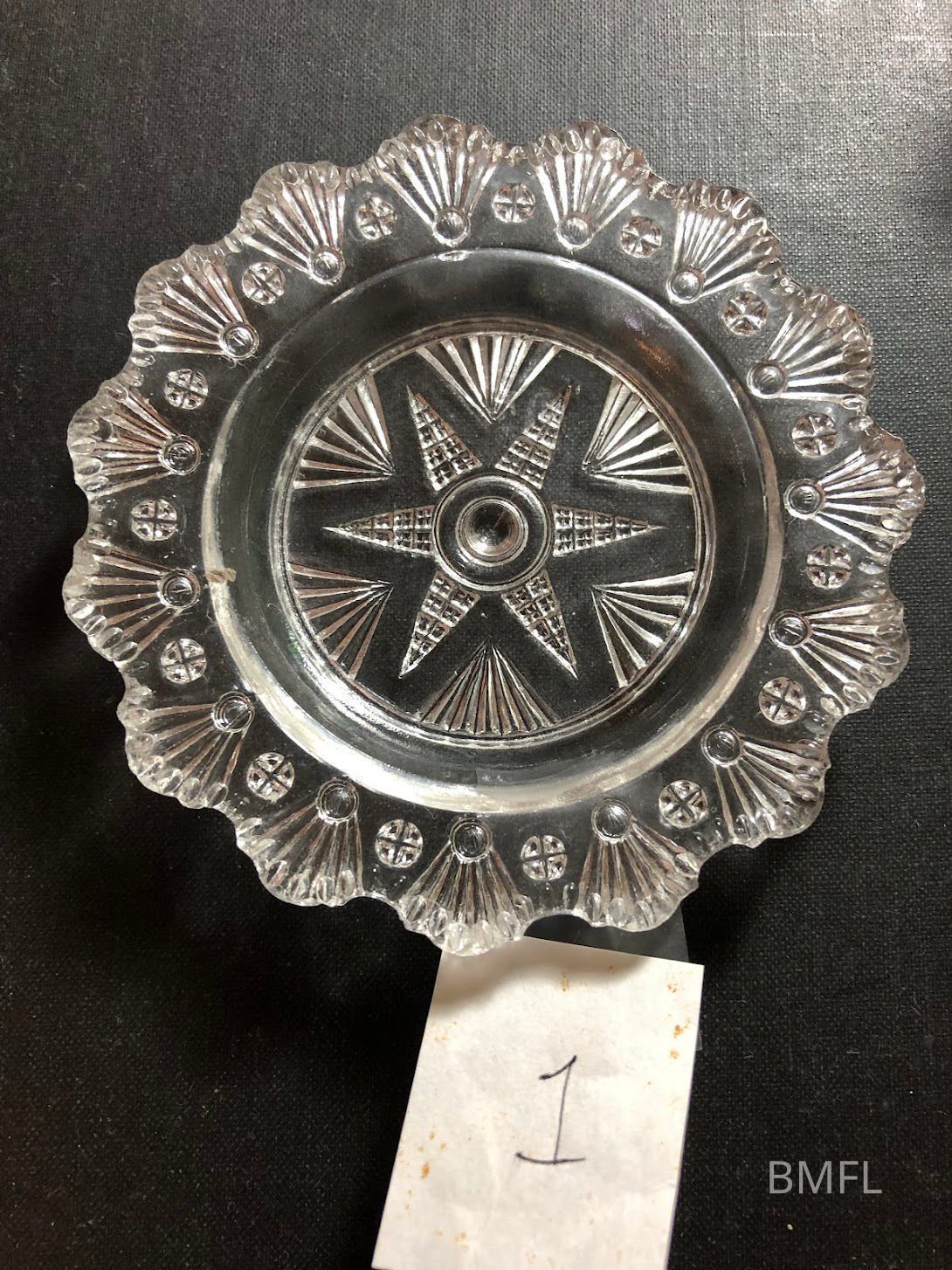 Thick clear glass cup plate with pressed design. Made in plentiful numbers.Use