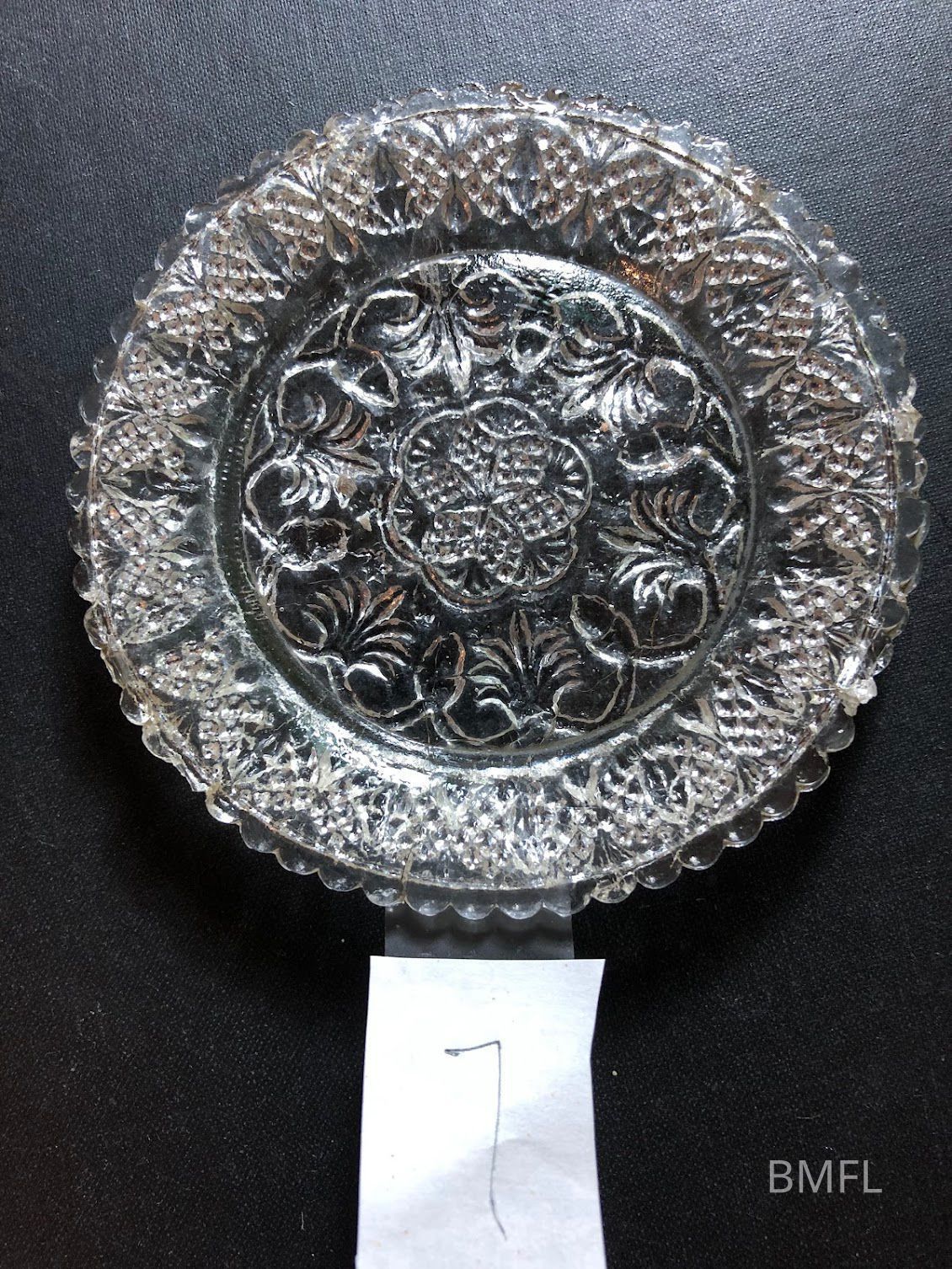 Chipped clear glass plate with pressed designUse