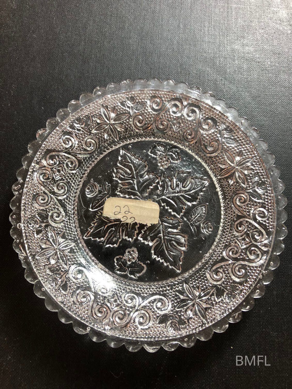 Clear glass cup plate with 1 small chip and a pressed design. PlentifulUse