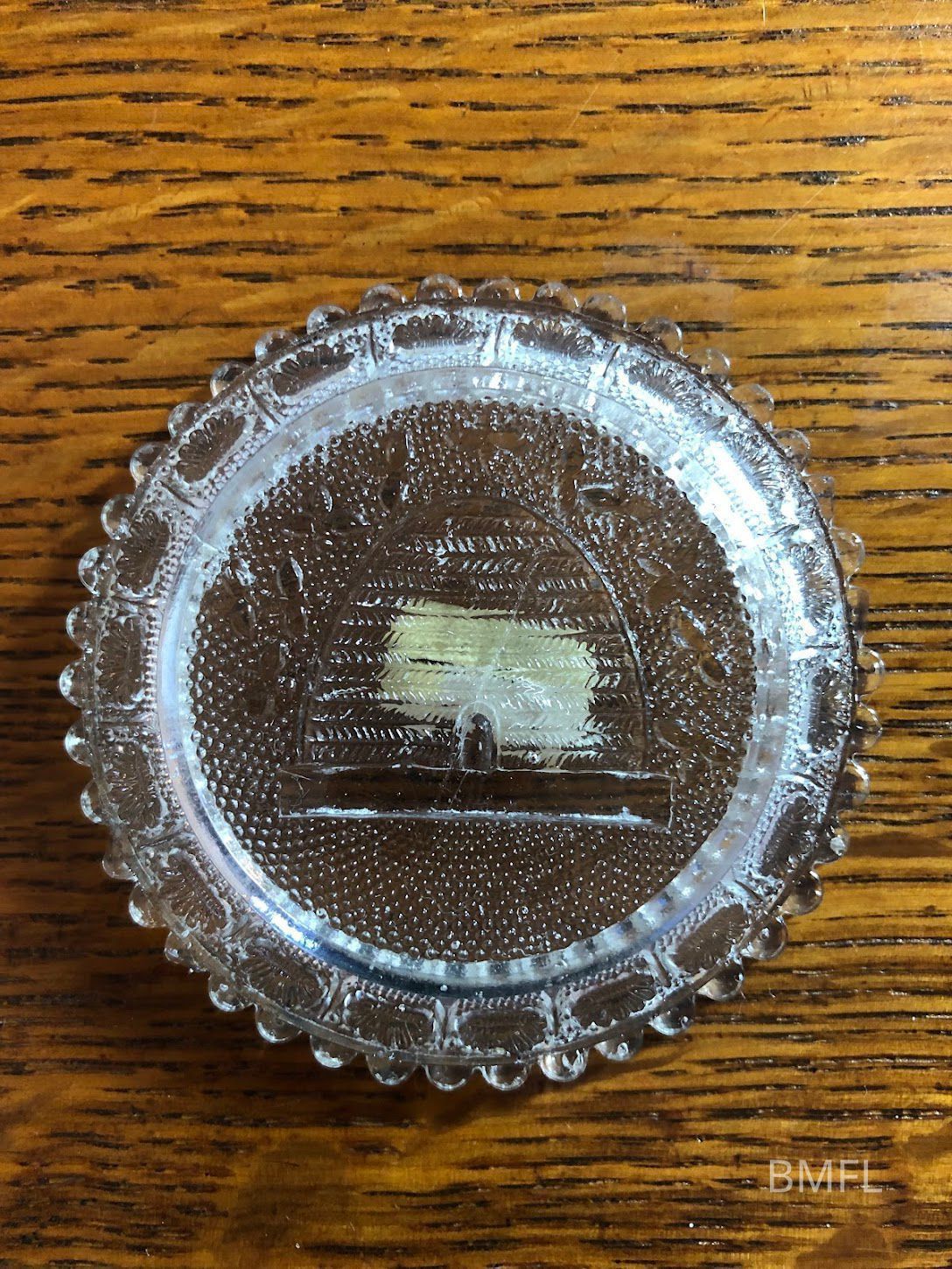 An article published in January of 1951 announced a donation to the Bixby Library from the late Josephine Meneely: her collection of glass cup plates, along with glass paperweights. The article explained cup plates as follows: "Cup plates were not coasters as those unfamiliar with antiques sometimes believe. Inn the 1820s and 1830s it was considered the proper thing to drink tea from the saucer instead of the handleless cup. When the tea was poured into the saucer, the cup was placed on a small cup plate of glass, sometimes of china, to avoid soiling the tablecloth. the fashion changed when cups again were made with handles. Cup plates were smaller than honey plates or preserve dishes, about three inches in diameter."Collection