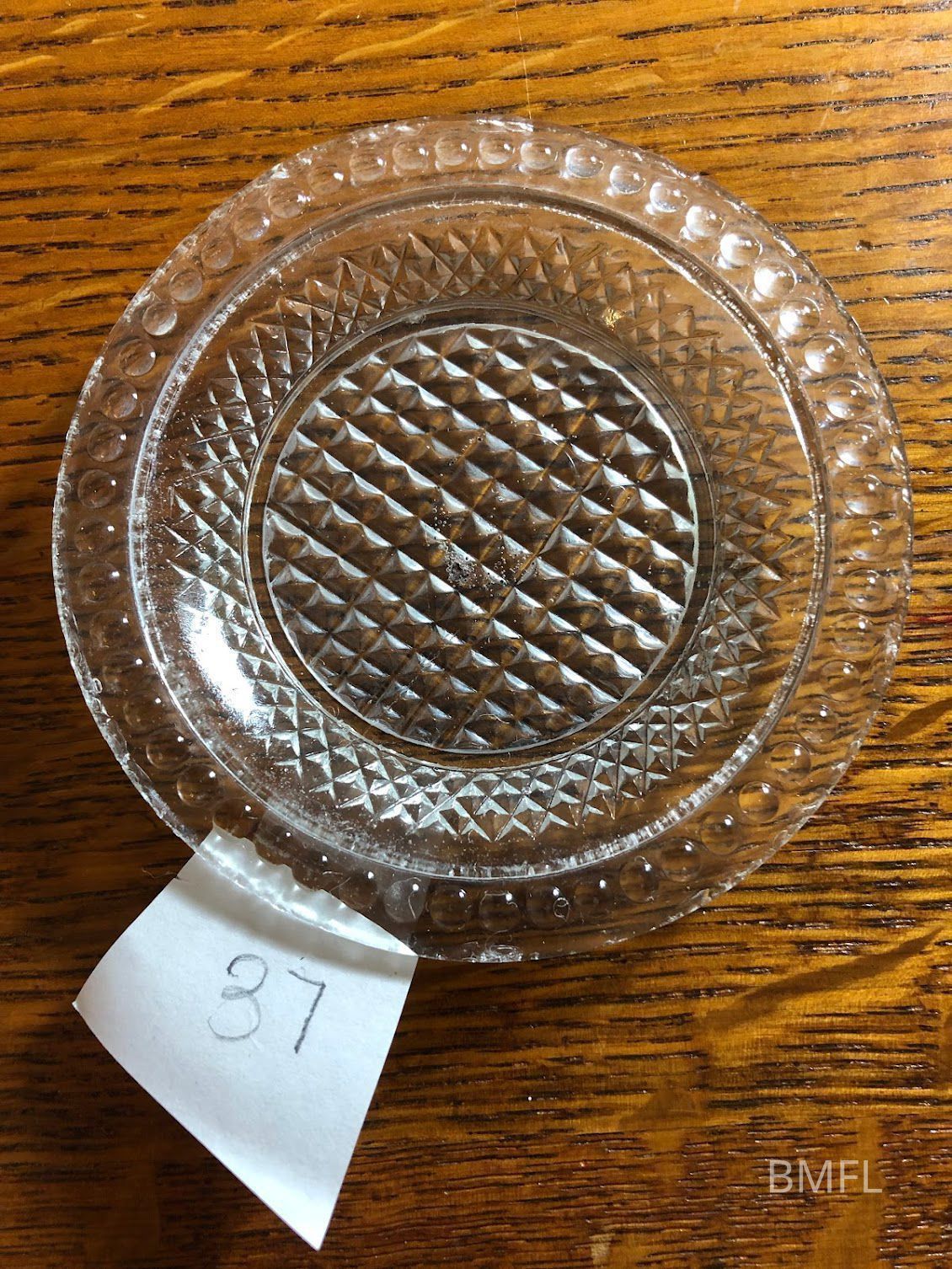 Clear glass cup plate with pressed design. CommonUse