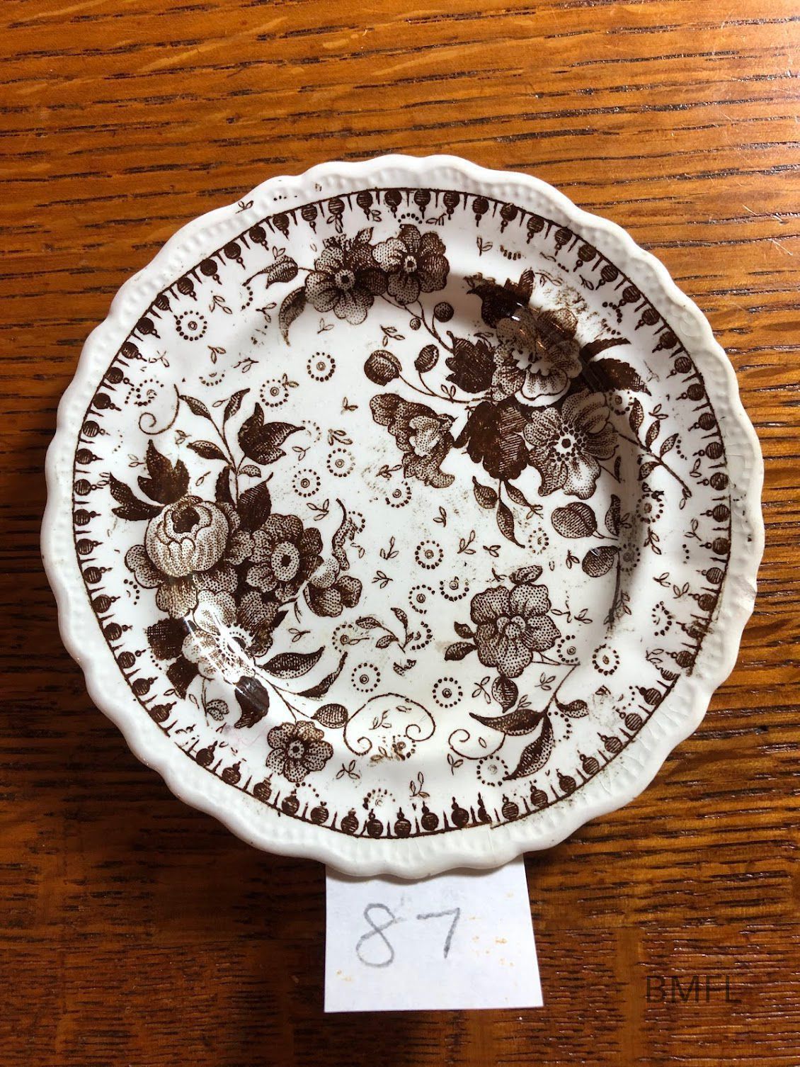 Brown and white patterned pottery cup plate in good condition. Most likely made in EnglandUse