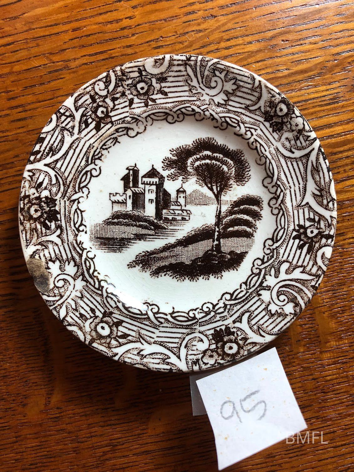 Brown and white pottery cup plate with an elaborate design and a chip on the rim. Otherwise in good condition. Most likely made in England.Use