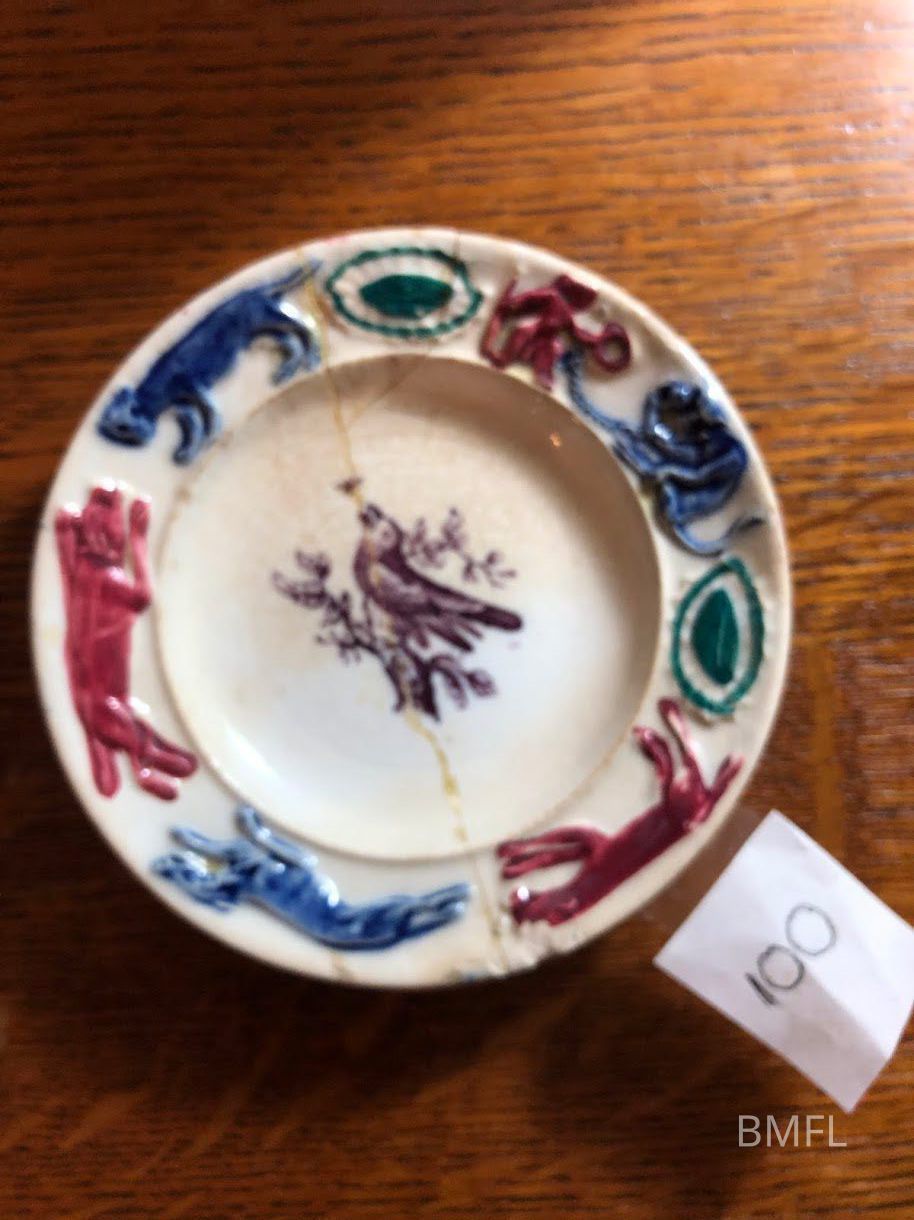 Small pottery plate with colorful animals "running" around the rim and a brown bird in the center. Broken in the middle and poorly glued together. In poor condition, one chip. Most likely made in England.Use