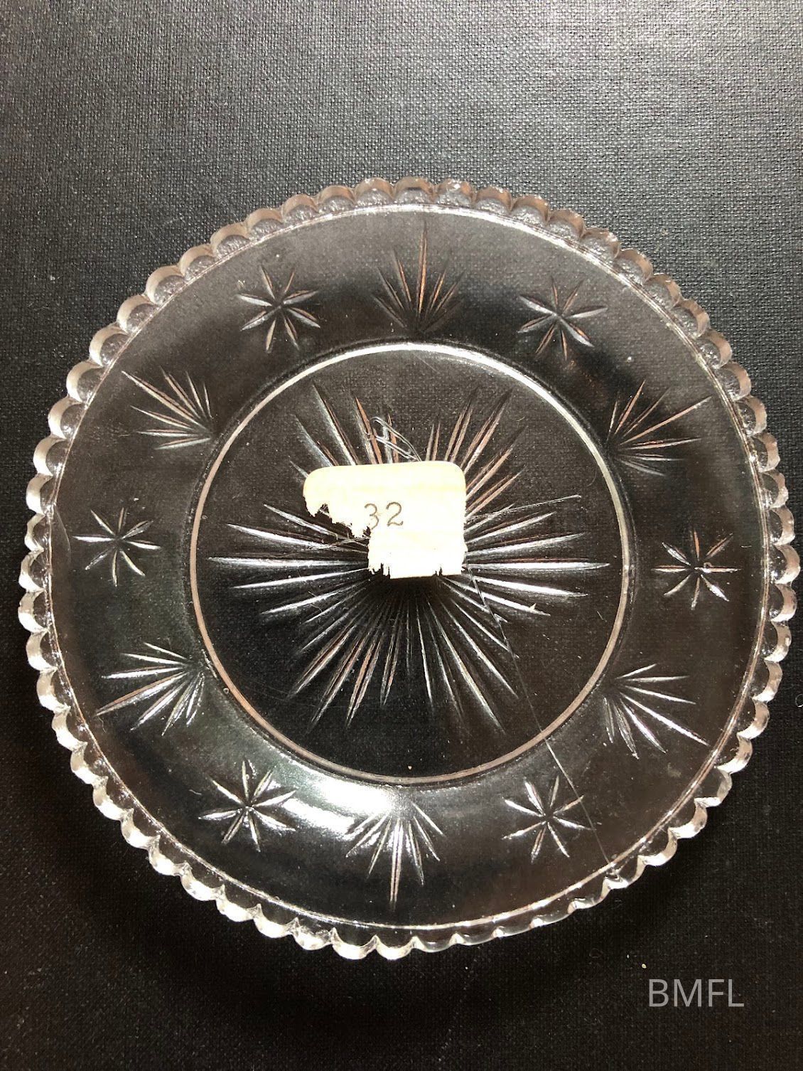 Clear glass cup plate with 1 chip and a pressed design. CommonUse