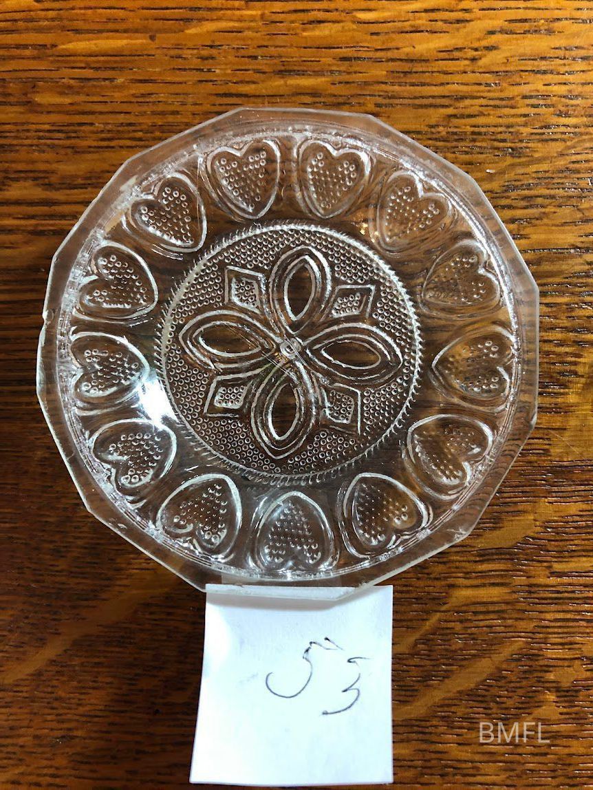 An article published in January of 1951 announced a donation to the Bixby Library from the late Josephine Meneely: her collection of glass cup plates, along with glass paperweights. The article explained cup plates as follows: "Cup plates were not coasters as those unfamiliar with antiques sometimes believe. Inn the 1820s and 1830s it was considered the proper thing to drink tea from the saucer instead of the handleless cup. When the tea was poured into the saucer, the cup was placed on a small cup plate of glass, sometimes of china, to avoid soiling the tablecloth. the fashion changed when cups again were made with handles. Cup plates were smaller than honey plates or preserve dishes, about three inches in diameter."Collection