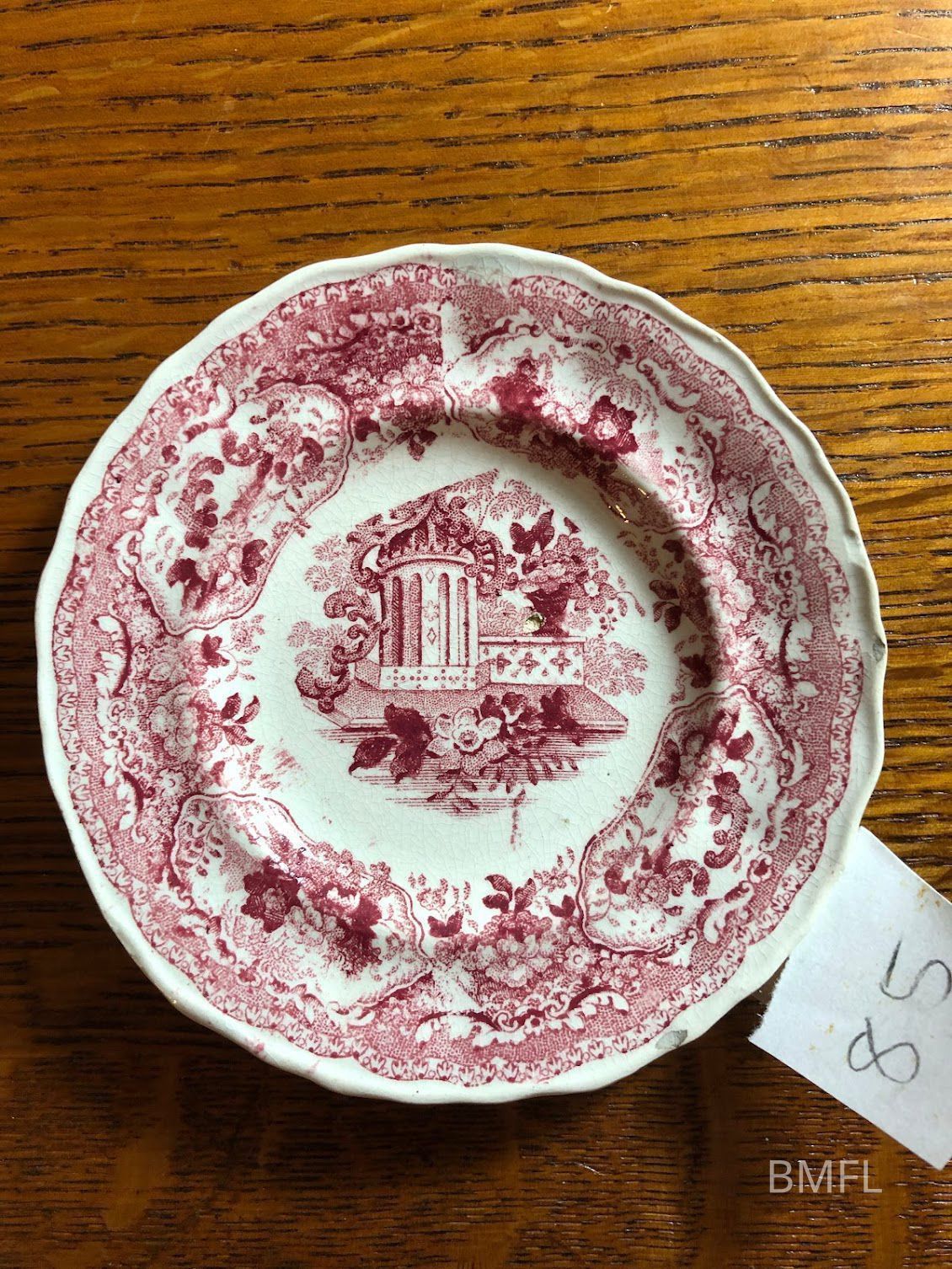 Red and white design of a small building and flowers on a pottery cup plate in good condition. Most likely made in EnglandUse