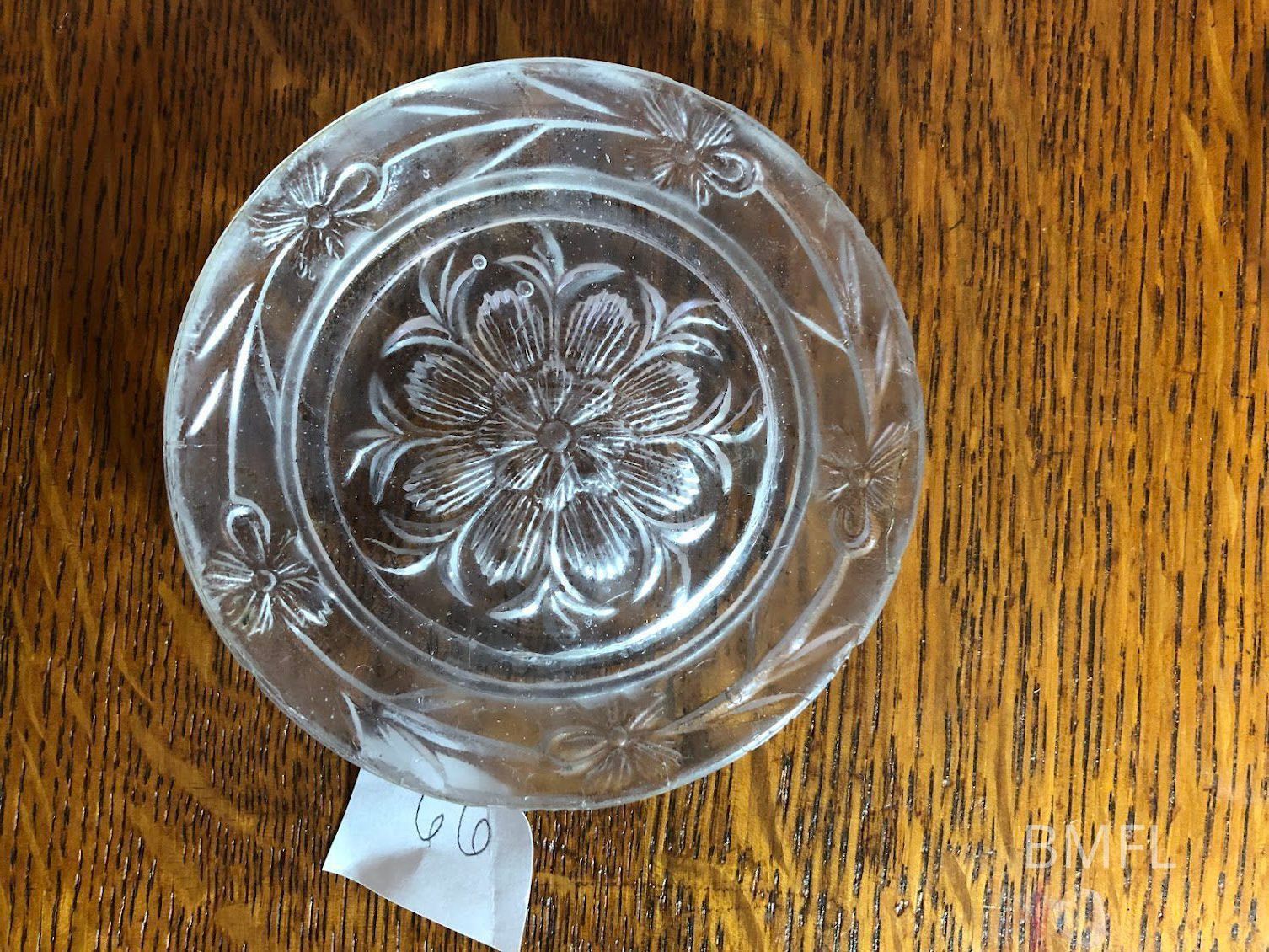 Clear glass "butter chip" or "butter pat" with pressed design. Rarity unknownUse