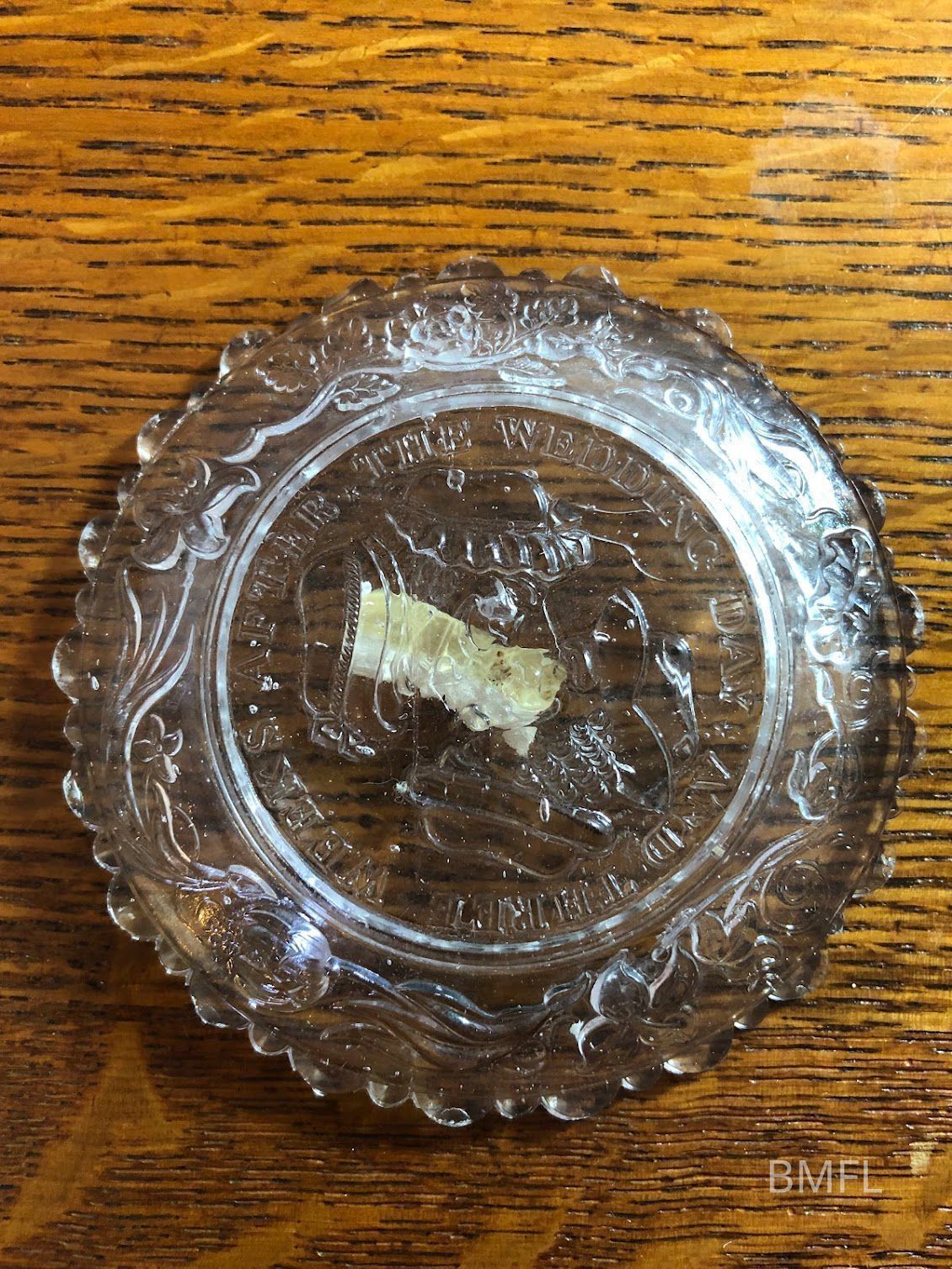 Clear glass cup plate with a female face looking at a male face and the words: "The wedding day and three weeks after" in pressed design. ScarceUse