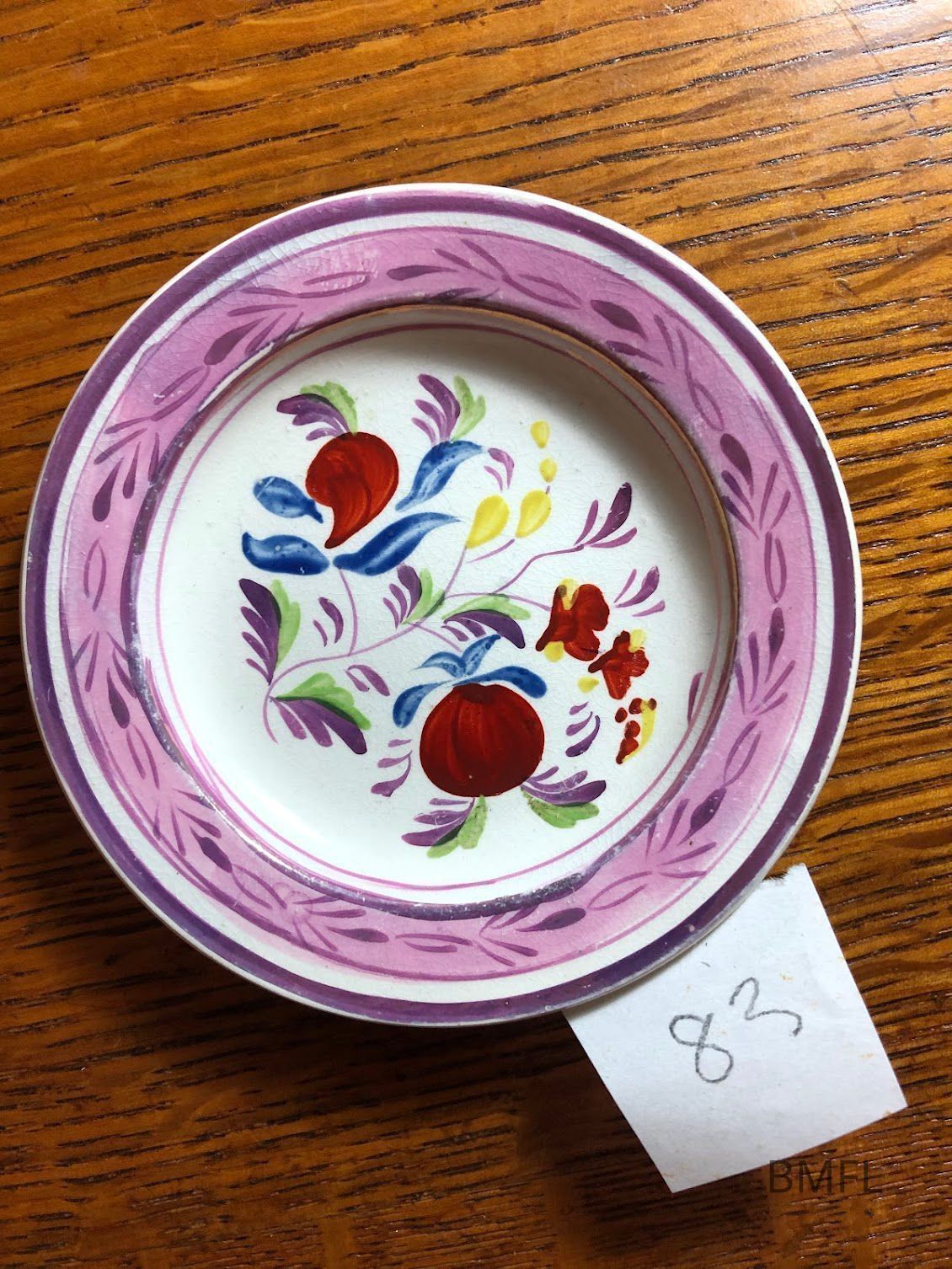 Pottery cup plate with a colorful design and a gold/purple rim on a pottery cup plate. In good condition. Most likely made in EnglandUse