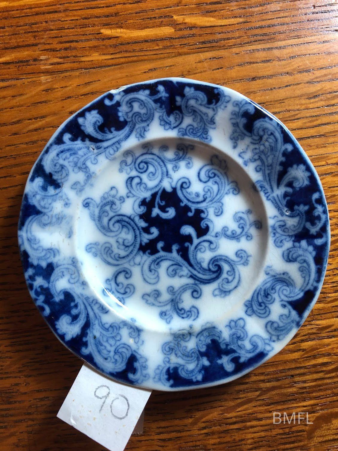 Pottery cup plateDeep blue and white pattern on a pottery cup plate. Large imprint on the back, shaped like a royal seal. In good condition. Most likely made in EnglandUse