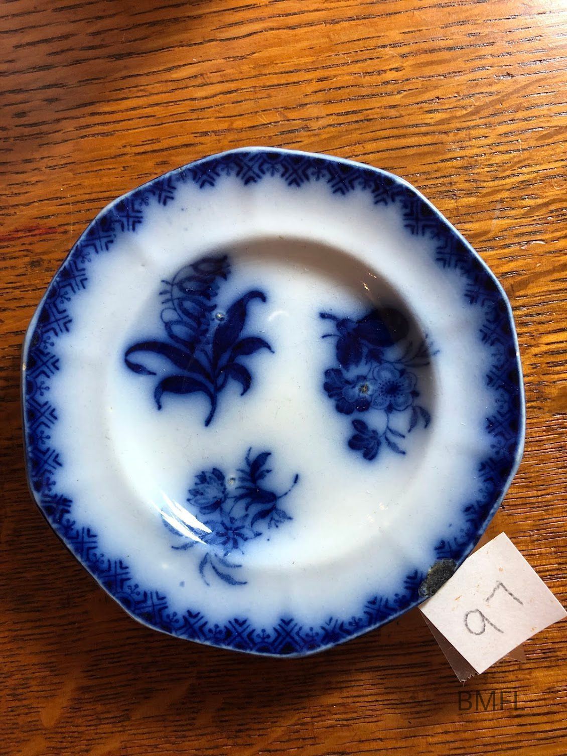 Deep blue and white pottery cup plate with intricate rim design and three bunches of flowers in the center. Imprint on the back looks somewhat like a royal seal. Some makers flaws, but basically in good condition. Most likely made in EnglandUse