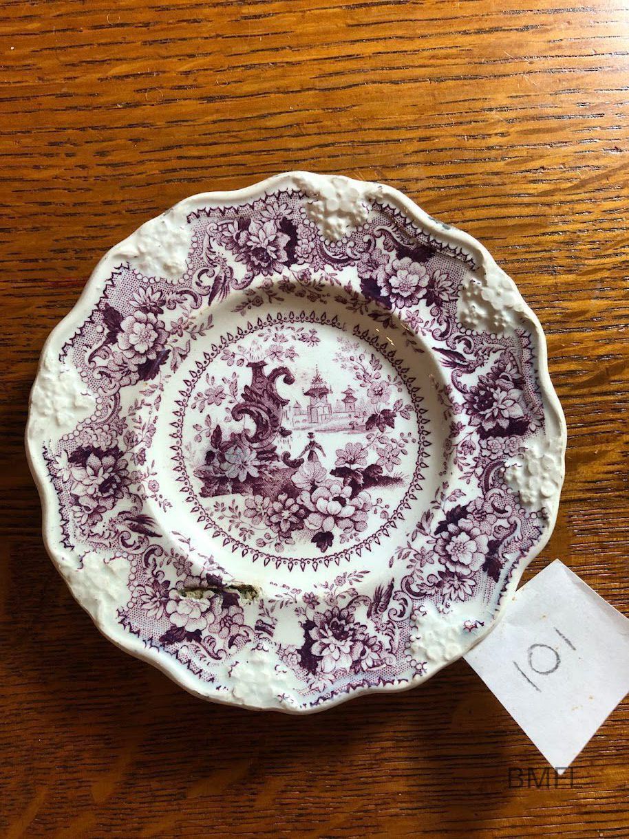 Purple and white very complex pattern on a pottery cup plate and pressed pottery flowers on the rim. Mostly illegible words on the back: Finest [illegible] ELB. Plate is in good conditionUse