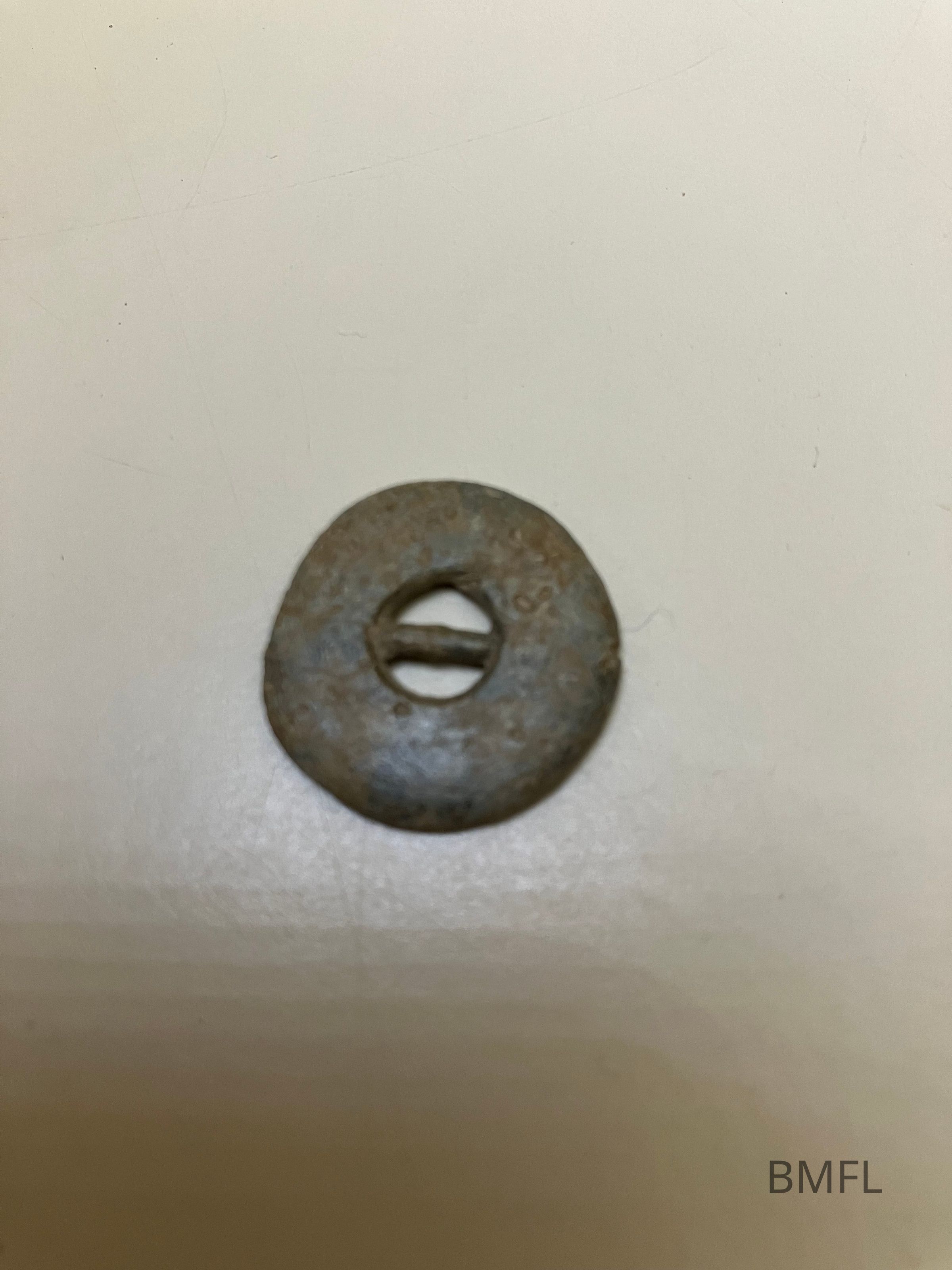 Round, metal disc with a hole in the center and a small bar across the middle.Collection