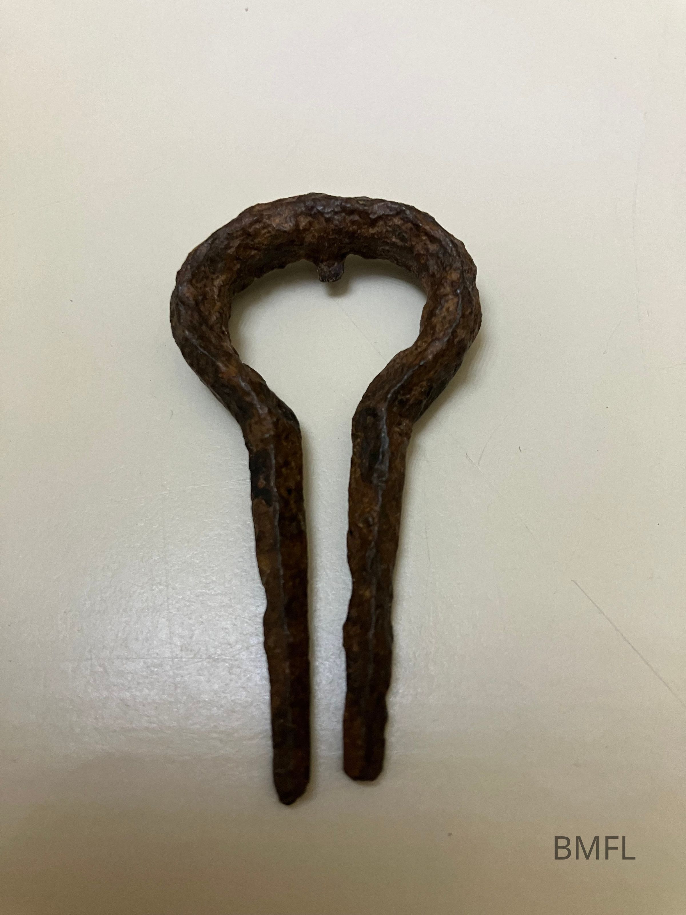Corroded iron prong in the shape of a hairpin.Collection