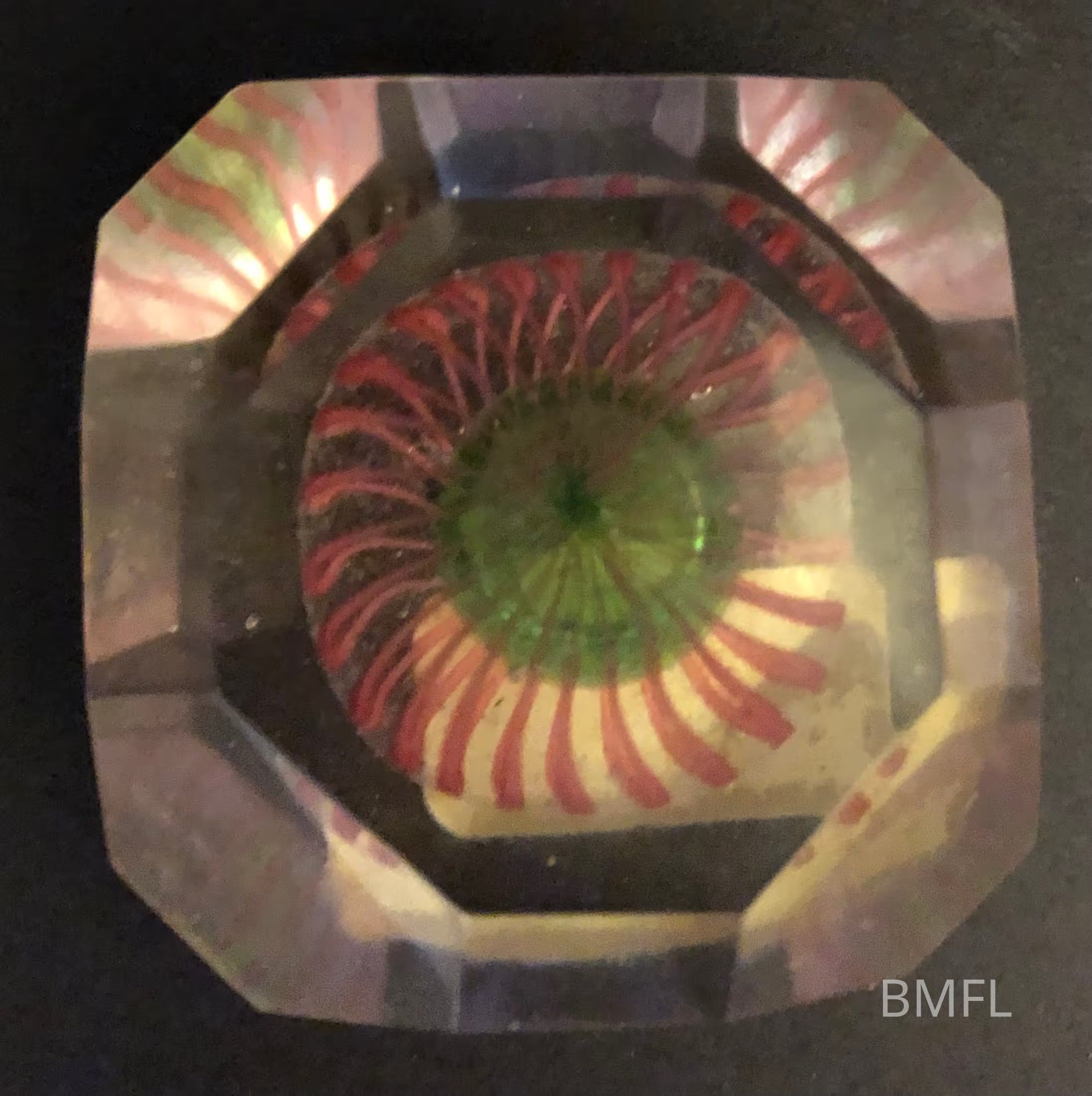 Small, many-faceted glass paperweight with a flower whose center looks somewhat like an eye, and whose petals are reflected throughout the facets for a very intriguing perspective.Use