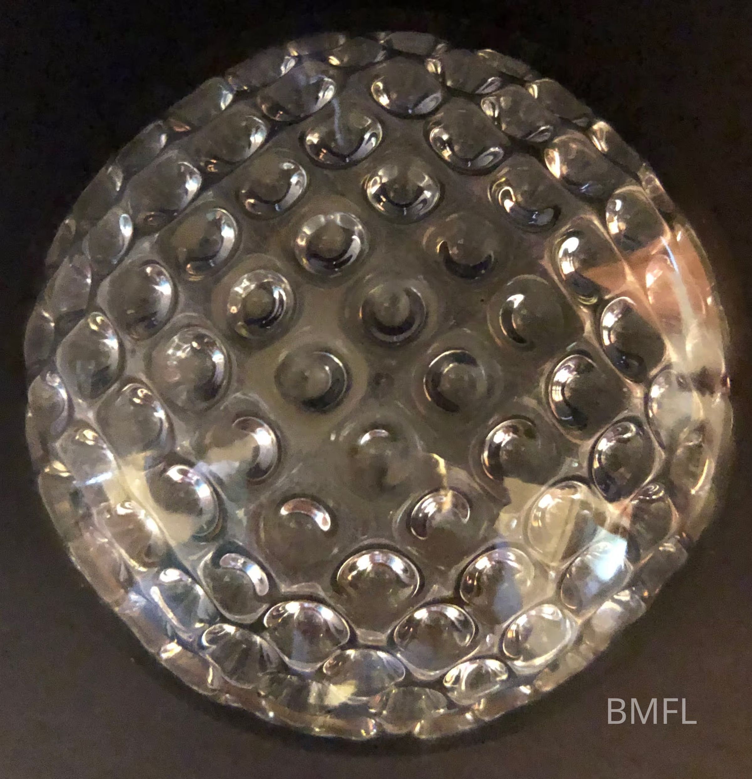 Round clear glass paperweight enclosing a smaller globe with a decorative design made with glass bumps covering it.Use