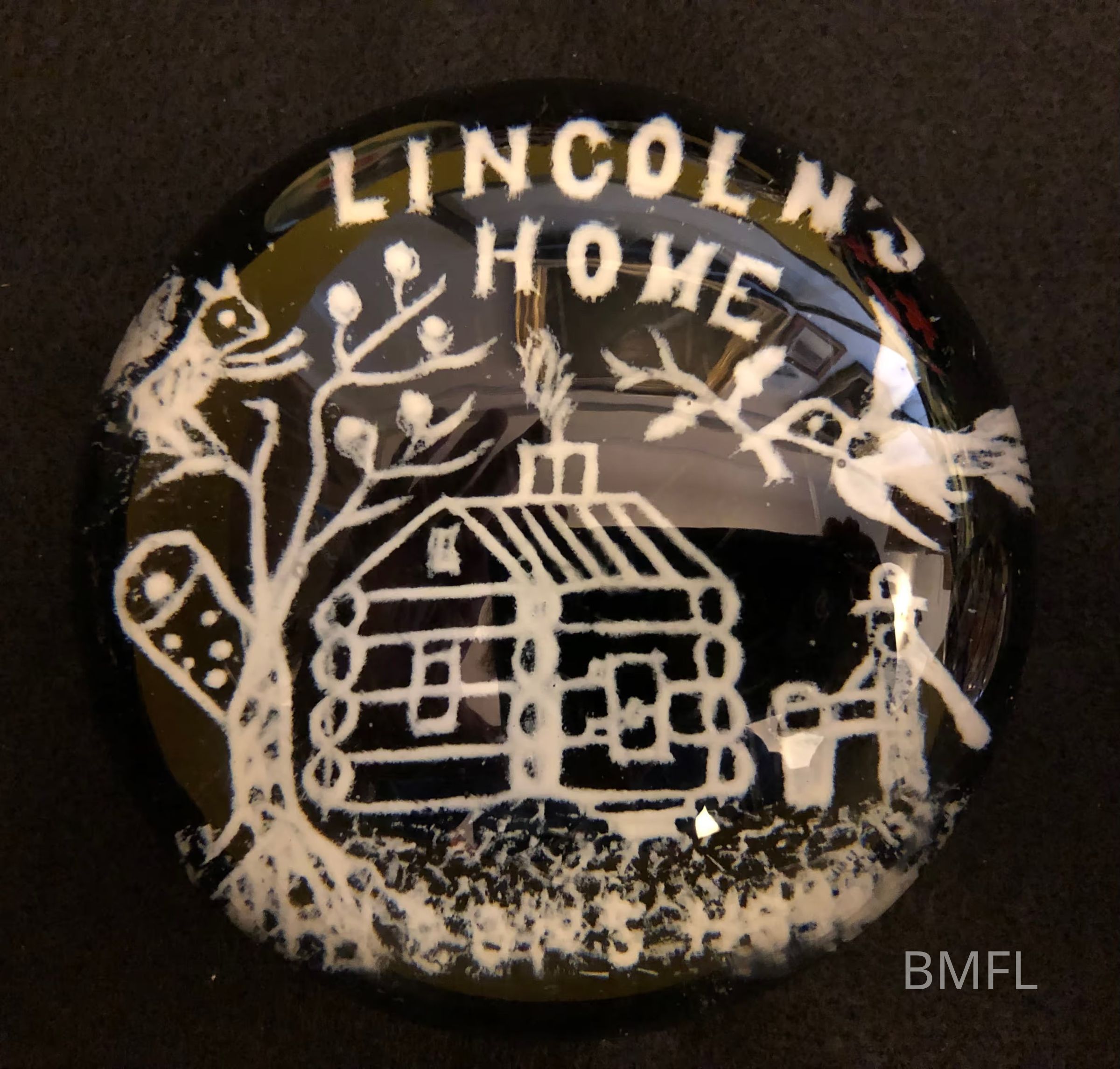 Round glass paperweight with black background and the heading "Lincoln's Home". There are also words on the lower part of the paperweight, but they are illegible. The paperweight has a folk art picture of a log cabin with a man chopping wood, a bird flying with a branch in its beak and a squirrel in a tree. Very unusual for this collection.Use