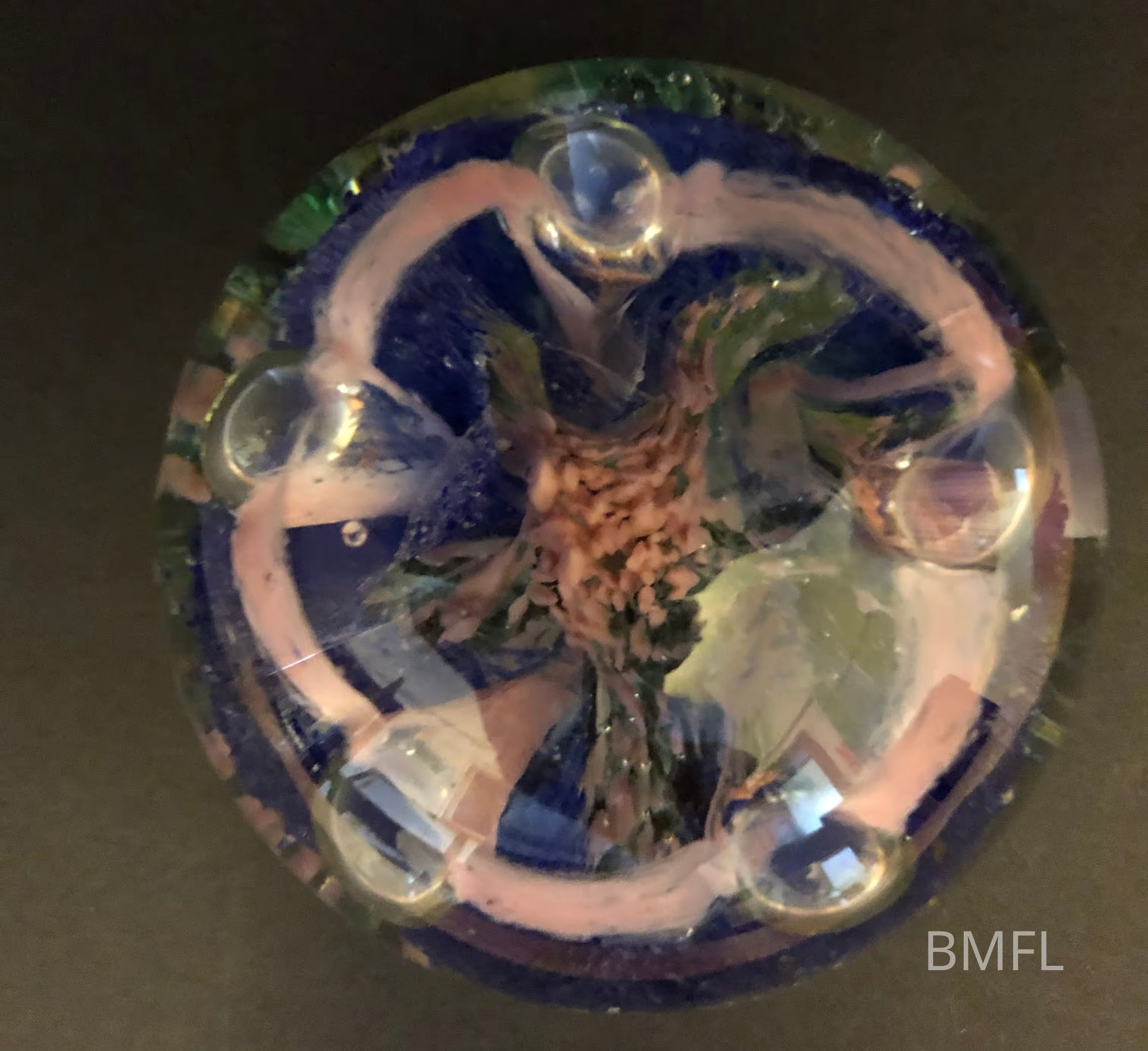 Round clear glass paperweight with large blue flower having pink edging. The edges of the flower are enhanced with five blown bubbles. There are also smaller blue and pink flowers below the larger one.Use