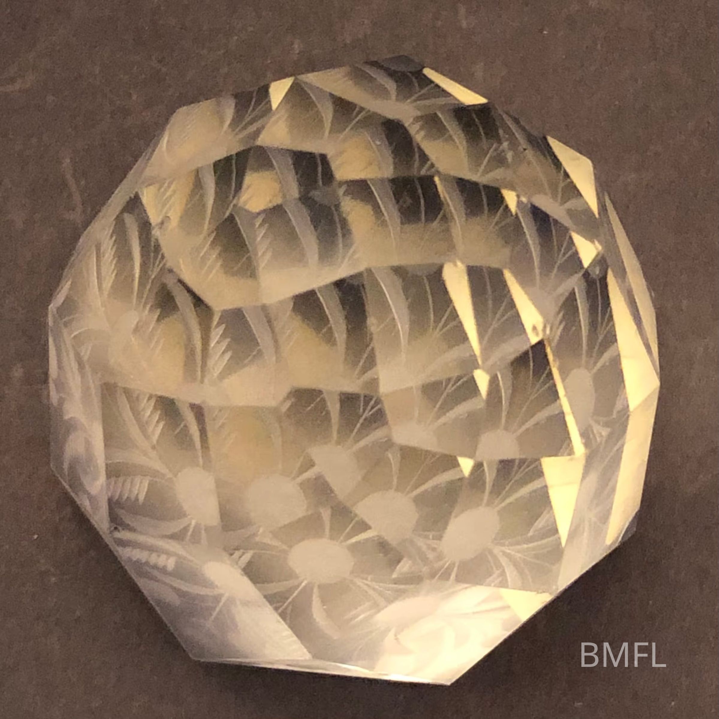 Round/many-faceted clear glass paperweight with delicate etching on the bottom which can be seen through it.Use