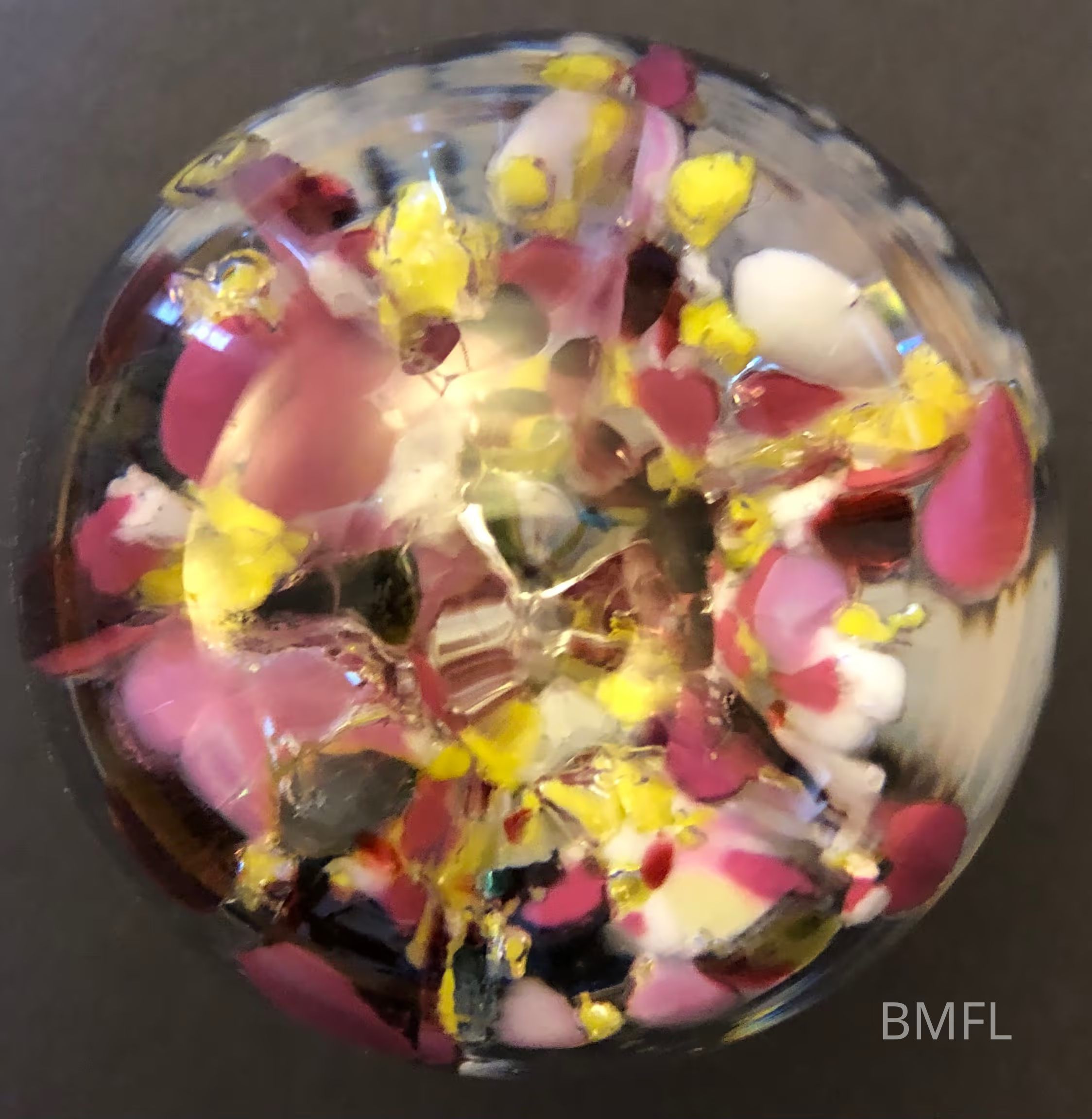 Glass paperweight with elegant pink, yellow and white flowersUse