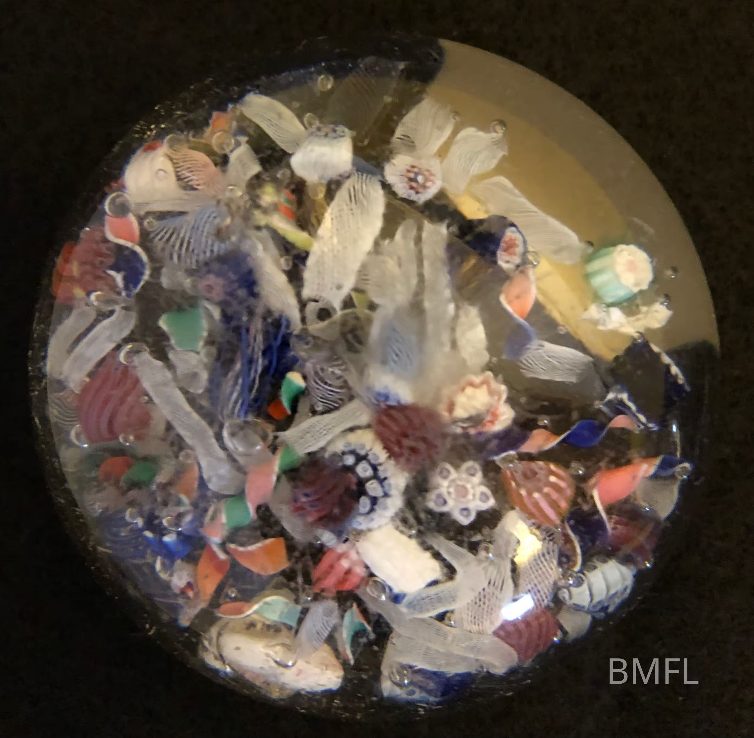 Round glass paperweight filled with many different-shaped pieces of glass, mostly white, but some red, blue, and green.Use