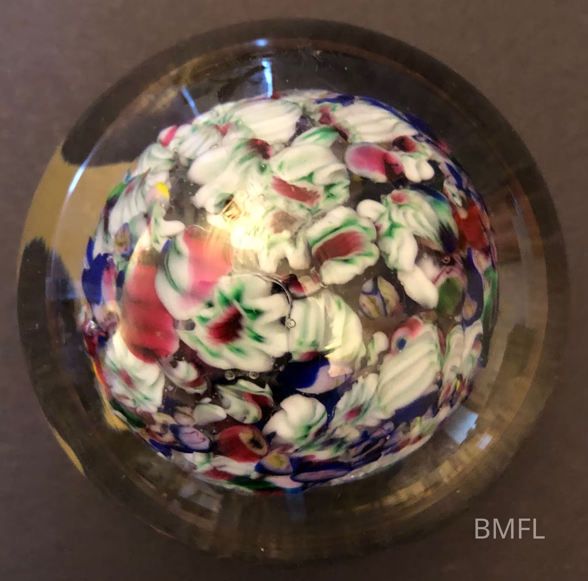 Round glass paperweight filled with an unusual clump of white, green, and red flowers. Very pretty but much more crowded together than many of the flower paperweights in the collection.Use