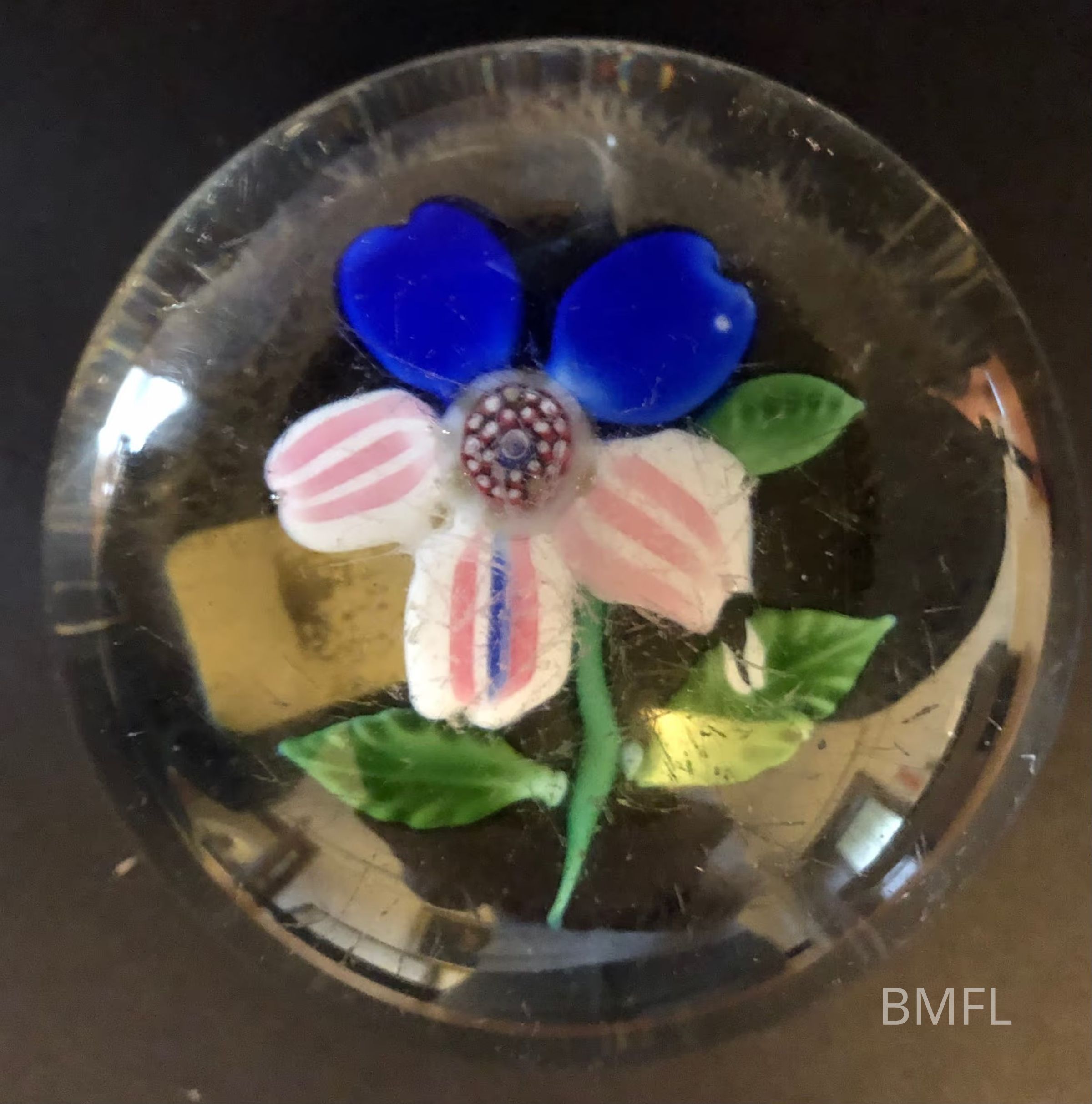 Round glass paperweight with one flower. The flower has unusual coloring: two blue petals and three striped petals of pink and white. Also there are a polka-dotted center, a stem, and three leaves.Context