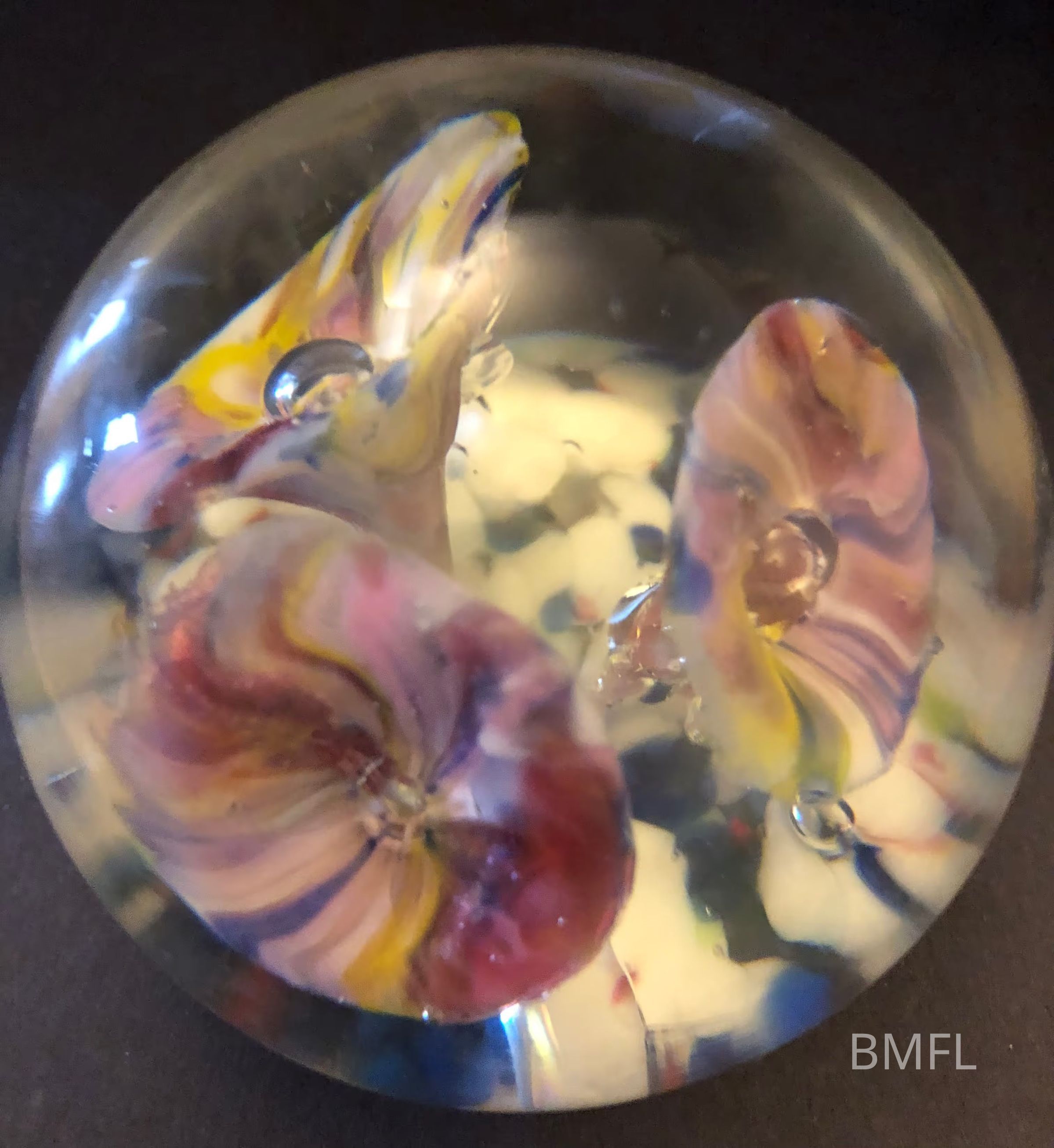 Round glass paperweight with three mostly pink but multicolored flowers, each with a blown bubble as the center.Use