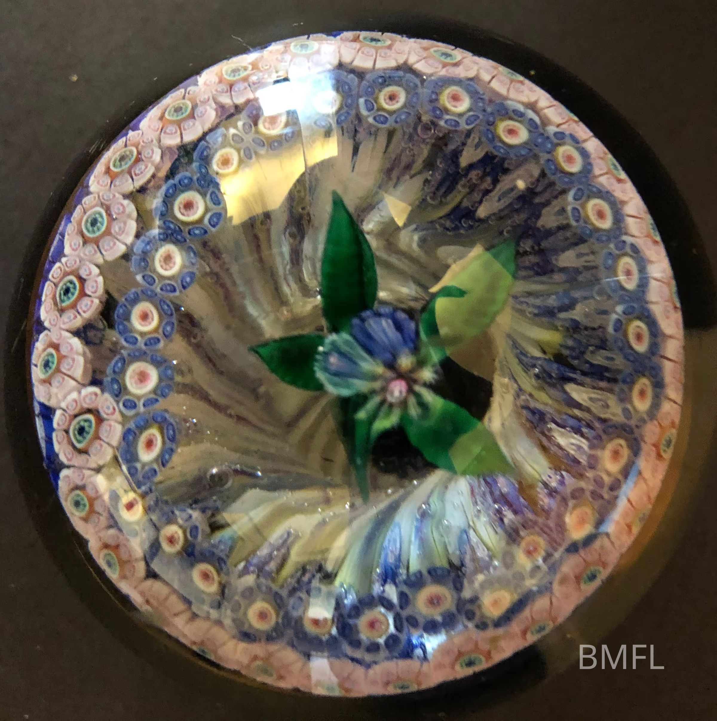 Glass paperweight with intricate circles of pink flowers and blue flowers around the edge of long stems surrounding a larger blue flower.Use