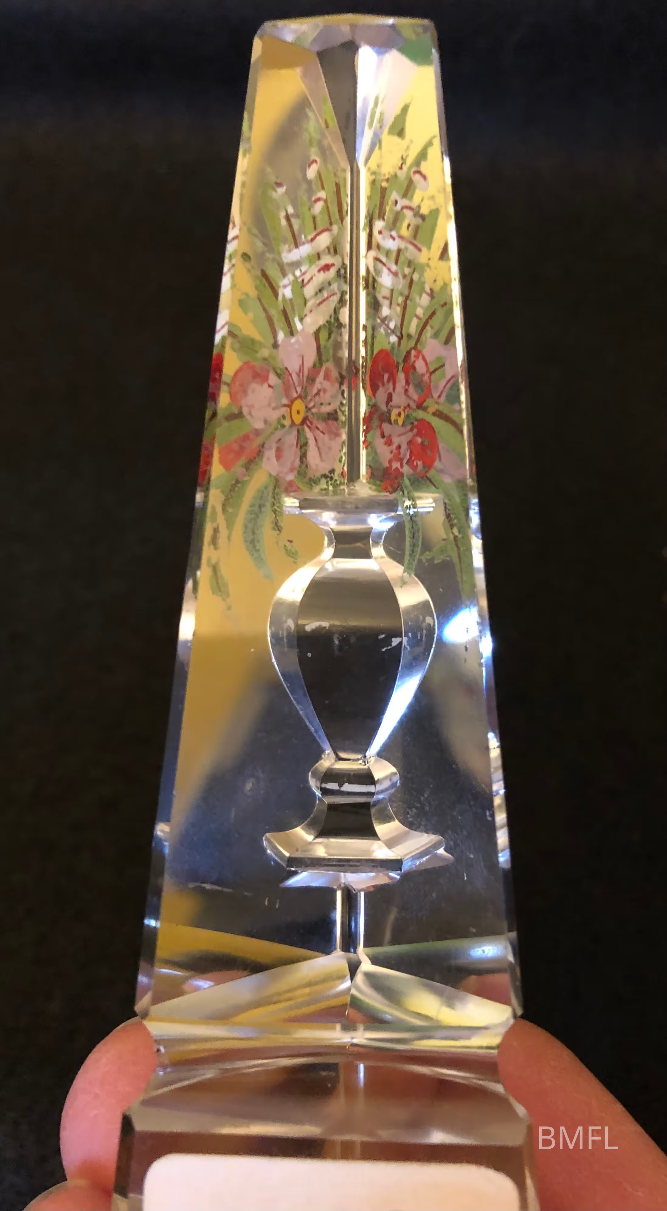 Unusually shaped three-sided paperweight with some carving detail which shows through the back side, as well as external painted flowers and greenery. There are chips off of the base.Use
